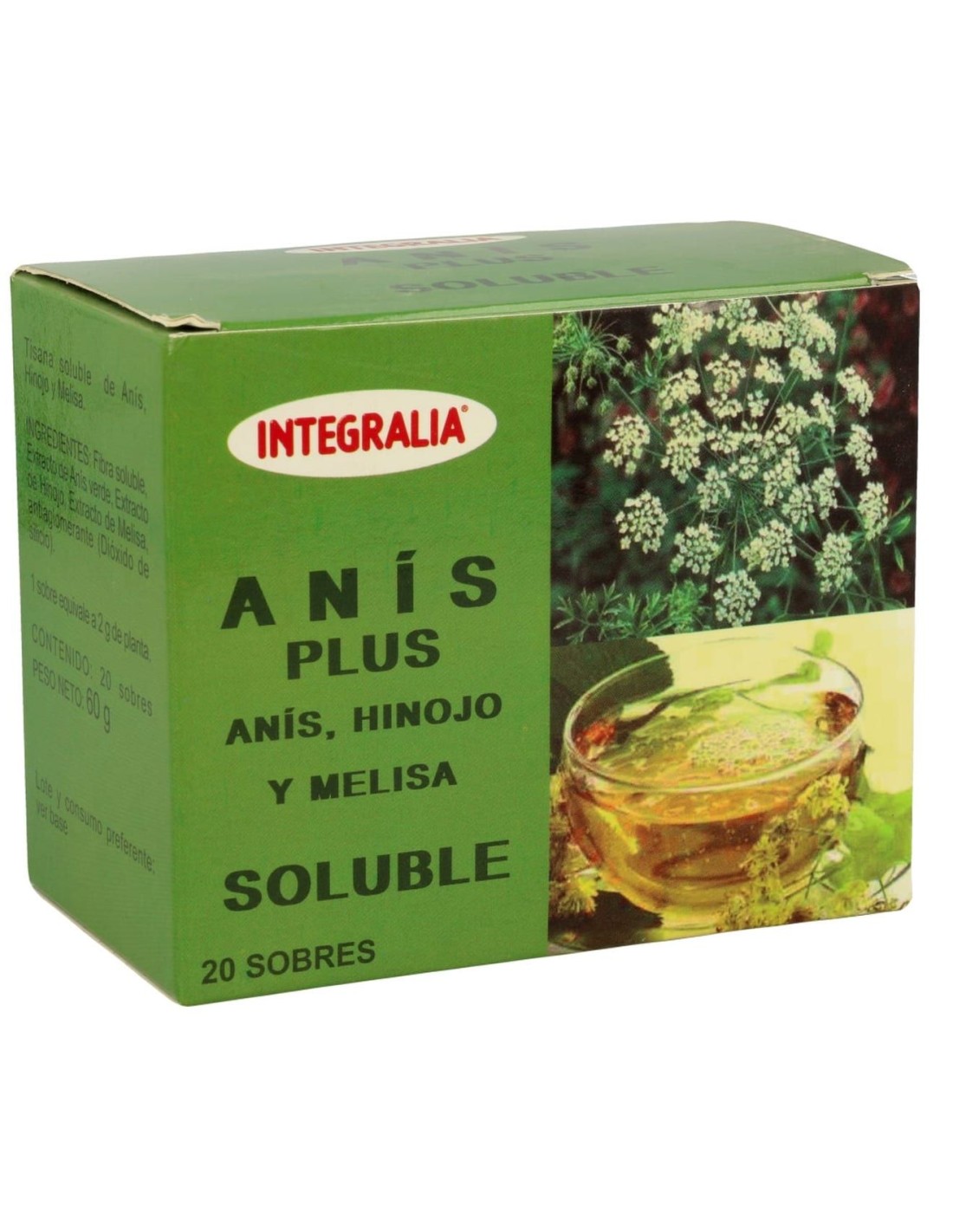 Infusión o tisana soluble muy fácil de preparar, la cual contiene extractos de anís, hinojo y melisa. Desarrollado por Integralia para aportar los beneficios de dichas plantas de forma rica y saludable. Es un producto completamente natural, ya que no contiene saborizantes artificiales ni químicos. Es un complemento alimenticio que se puede beber en cualquier momento del día, ya sea frío o caliente. Aporta las propiedades de sus ingredientes en un formato fácil de digerir y asimilar. Se recomienda su uso para cuando se sufre de problemas estomacales, de gases o del aparato digestivo. No se aconseja superar la dosis diaria recomendada de 1 a 3 sobres al día. No es un sustituto de una comida o dieta saludable y equilibrada. Mantener lejos del alcance de los niños y de ambientes húmedos o calurosos.