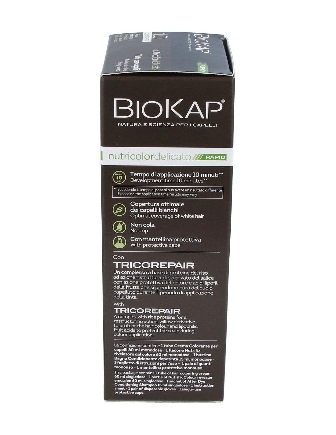 Con una velocidad de obturación de solo 10 minutos debido a su formulación que reduce el tiempo de aplicación del tinte. Se basa en ingredientes vegetales y una alta tolerabilidad de la piel. Nutre y repara el cabello mientras colorea y cubre perfectamente el cabello blanco. Con el complejo TRICOREPAIR a base de proteínas de arroz, derivados de Salice y ácidos lipofílicos de frutas. Enriquecido con aceite de Argán orgánico, nutre el cabello y lo hace más suave y brillante. Sin amoniaco, resorcinol, parabenos, fragancia ni parafenilendiamina. Sin níquel y dermatológicamente probado.