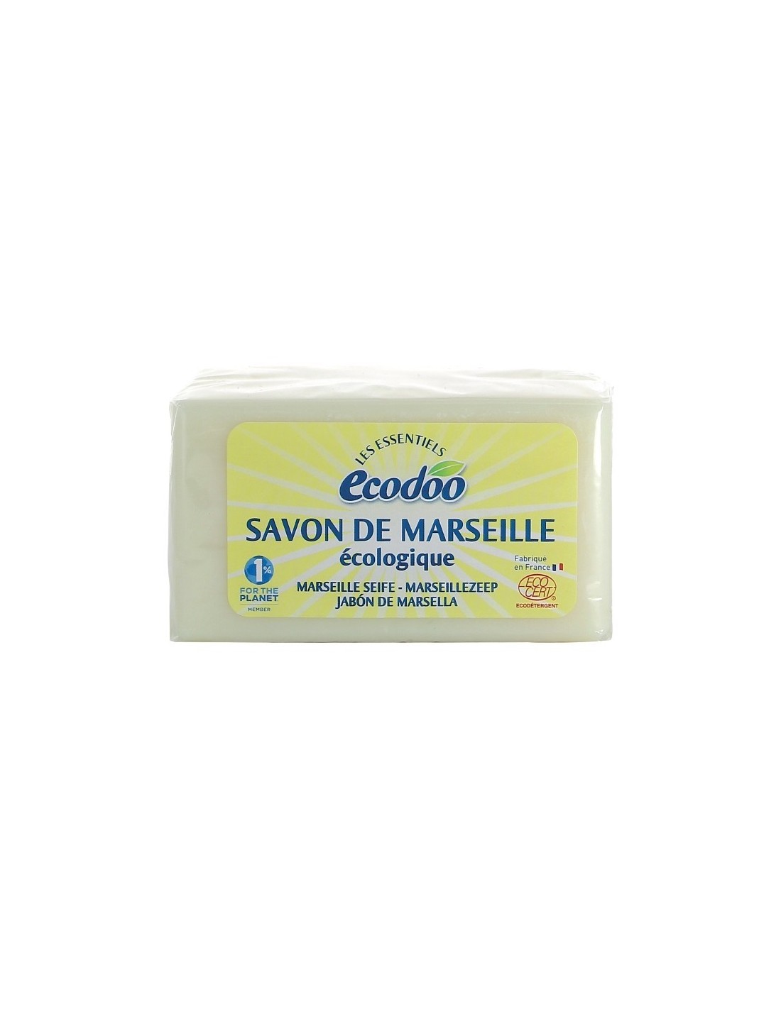 Pastilla de jabón de Marsella con ingredientes superiores al 30%, sin ningún aditivo de aceite de palma, de cocción en caldera. Con certificado EcoCert. Acción polivalente: muy buen quitamanchas, especialmente adecuado para los lavados delicados o la ropa de bebé, para dar brillo a las joyas, limpia el cuero, hidrata y da brillo a los azulejos, perfuma la ropa y repele las polillas.
