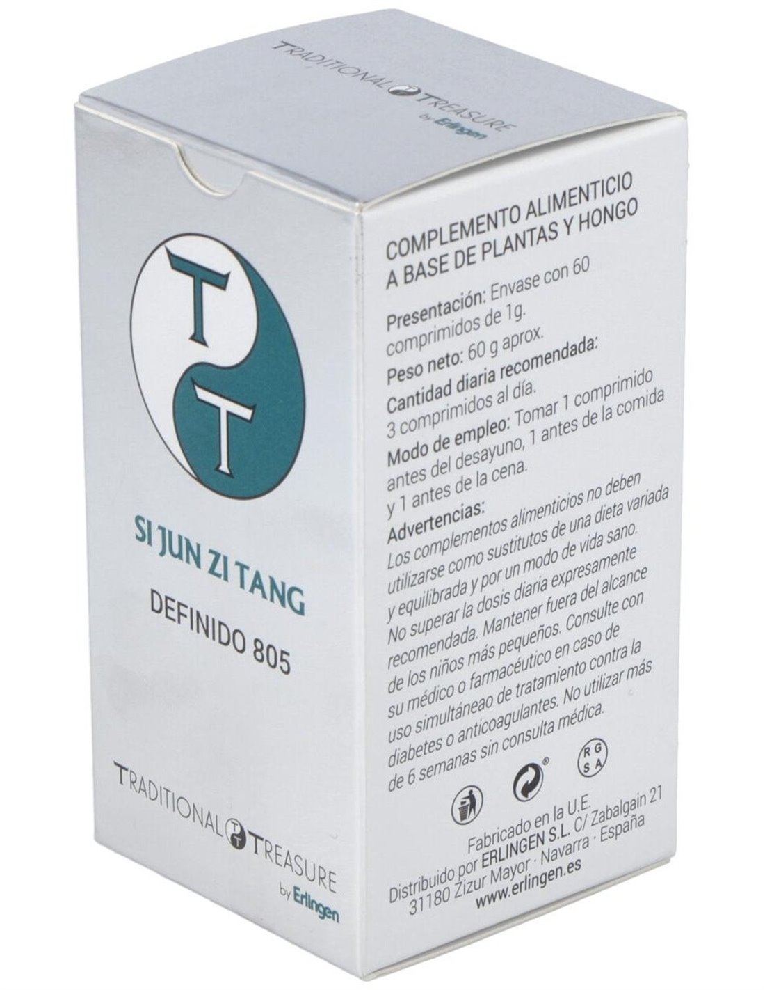 Agentes de carga (Celulosa microcristalina y Maltodextrina), Ginseng (Panax ginseng C.A. Mey.) 375 mg, Atractilodes (Atractylodes macrocephala Koidz) 375 mg, Poria (Poria cocos Wolf) 375 mg, Regaliz (Glycyrrhiza glabra L.) 375 mg y Agente de carga (Estearato de magnesio).