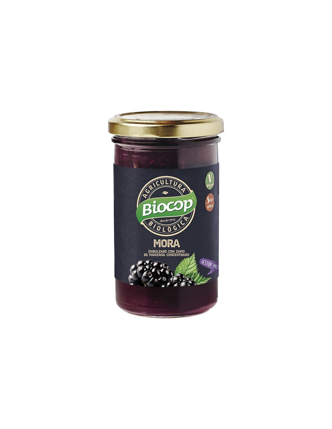 Compota de mora. Elaborada con moras maduras mediante cocción mínima para garantizar todo el sabor y aroma de la fruta. Endulzada con concentrado de zumo de manzana. Alimento vegano.