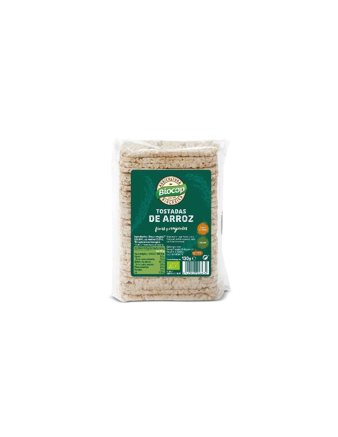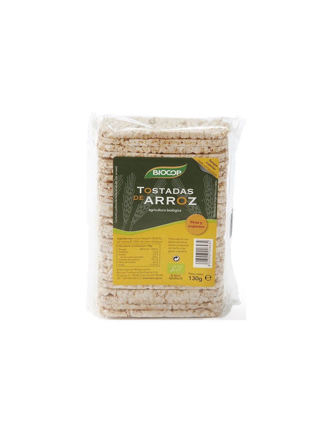 Maíz*, sal marina. Valor nutricional por 100 g: Valor energético 1672 kJ/394 kcal Grasas 1,4 g Ácidos grasos saturados 0,4 g Hidratos de carbono 89 g Azúcares 0,5 g Fibra alimentaria 1,5 g Proteínas 5,8 g Sal 0,3 g (*)= De agricultura biológica. +Contiene trazas de sésamo y productos a base de sésamo.