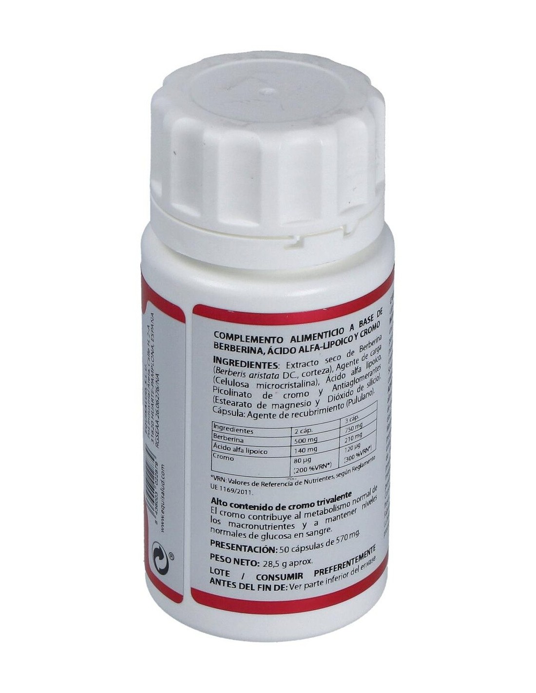 Berberina extracto seco (Berberis aristata DC.), 250 mg: ácido alfa-lipoico, 70 mg: picolinato de cromo (12,3% cromo), 40 µg. Envoltura: polisacárido de origen vegetal (pululano).