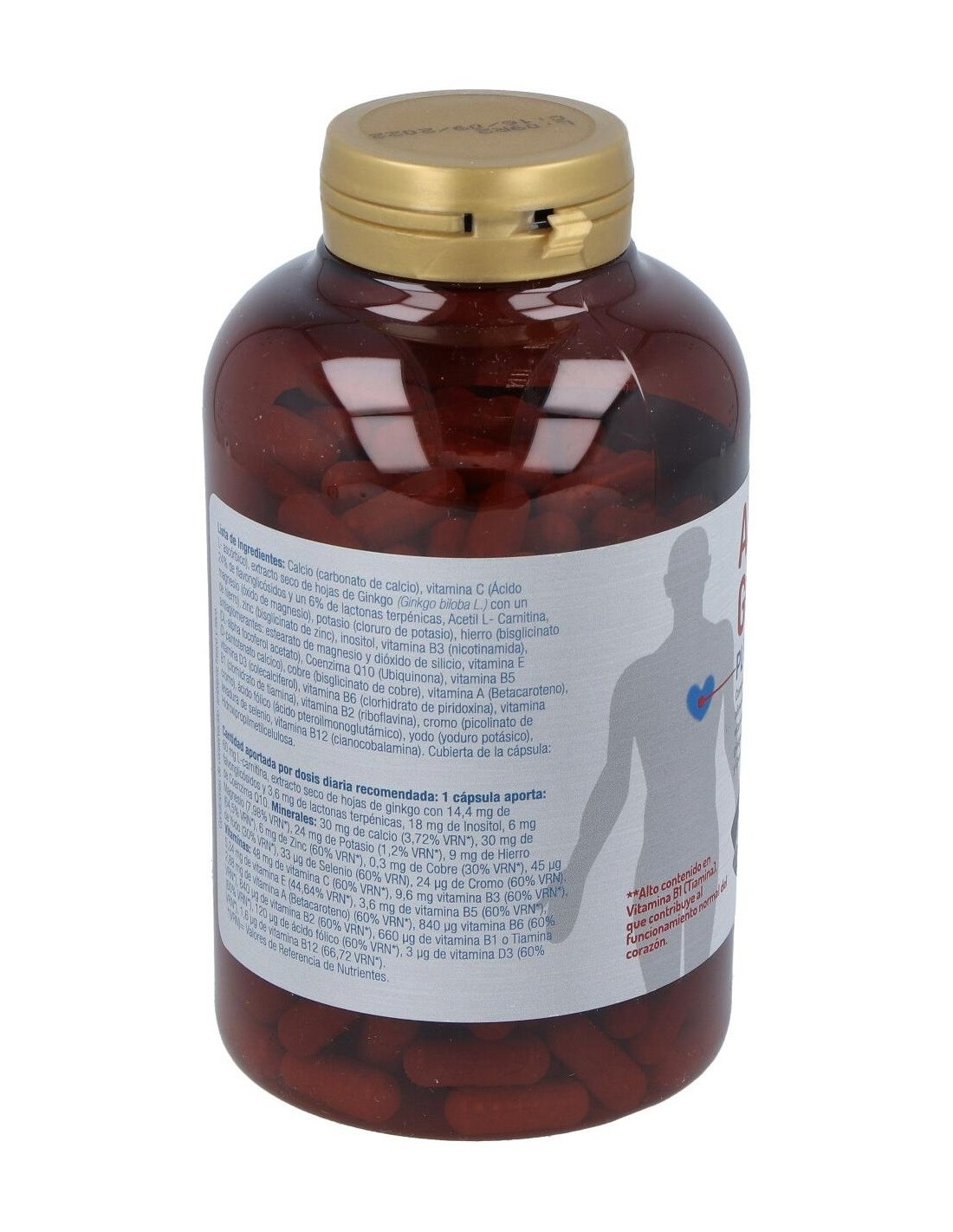 Calcio (carbonato de calcio), vitamina C (Ácido L- ascórbico), extracto seco de hojas de Ginkgo (Ginkgo biloba L.) con un 24% de flavonglicósidos y un 6% de lactonas terpénicas, Acetil LCarnitina, magnesio (óxido de magnesio), potasio (cloruro de potasio), hierro (bisglicinato de hierro), zinc (bisglicinato de zinc), inositol, vitamina B3 (nicotinamida), antiaglomerantes: estearato de magnesio y dióxido de silicio, vitamina E (DL-alpha tocoferol acetato), Coenzima Q10 (Ubiquinona).