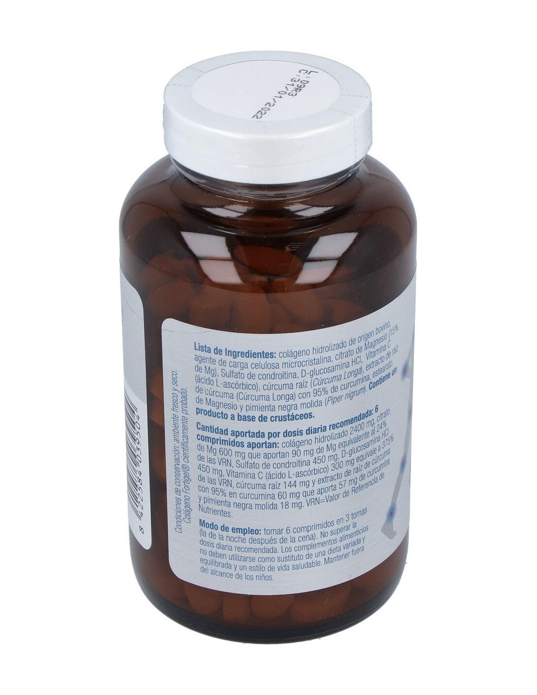 Colágeno hidrolizado de origen bovino, citrato de Magnesio (15% de Mg), Sulfato de condroitina, D-glucosamina HCl, Vitamina C (ácido L-ascórbico), cúrcuma raíz (Cúrcuma Longa), extracto de raíz de cúrcuma (Cúrcuma Longa) con 95% de curcumina, estearato de Magnesio y pimienta negra molida (Piper nigrum).