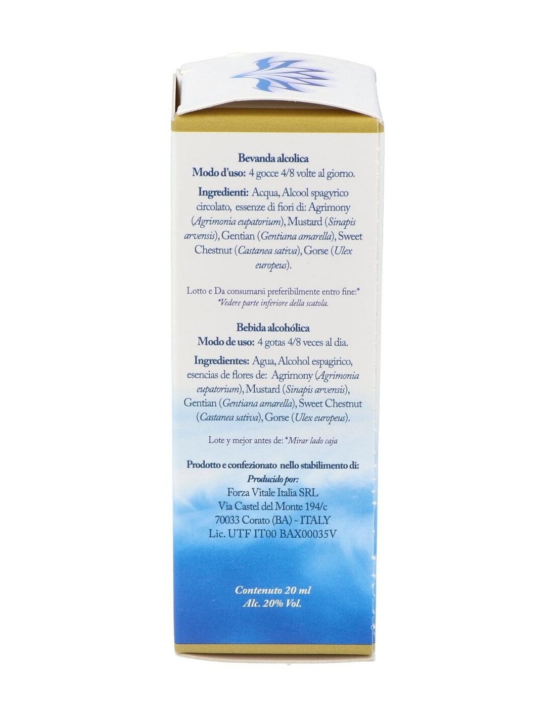 Agrimony (Agimonia eupatoria), Mustard (Sinapis arvensis) , Gentian (Gentiana amarella), Sweet Chestnut (Castanea sativa), Gorse (Ulex europeus), Alc. 10% Vol.