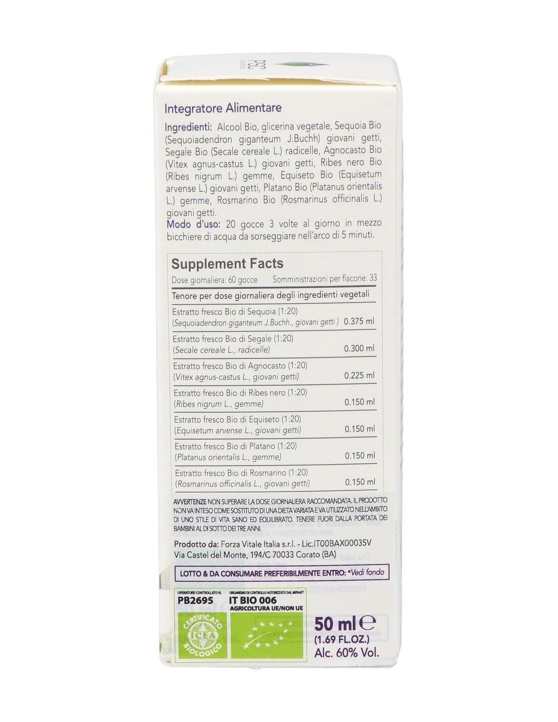 Alcohol, glicerol, Secoya Bio* (Sequoiadendron giganteum J. Buchh) brotes jóvenes, Centeno Bio* (Secale cereale L.) raízlle, Sauzgatillo Bio* (Vitex agnus-castus L.) brotes jóvenes, Grosellero negro Bio* (Ribes nigrum L.) yemas, Cola de caballo Bio* (Equisetum arvense L.) brotes jóvenes, Plátano Bio* (Platanus oritnalis L.) yemas, Romero Bio* (Rosmarinus officinalis) brotes jóvenes.