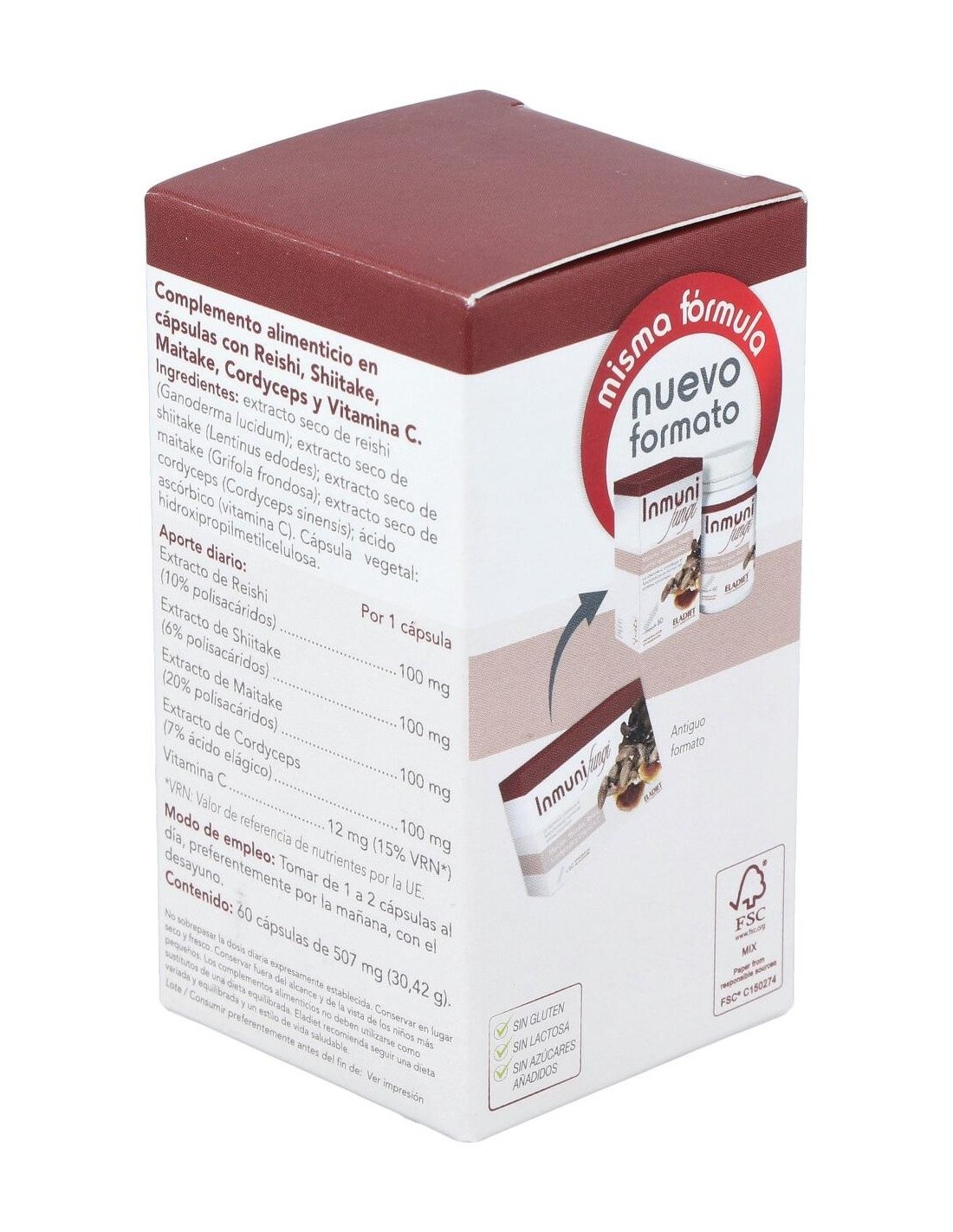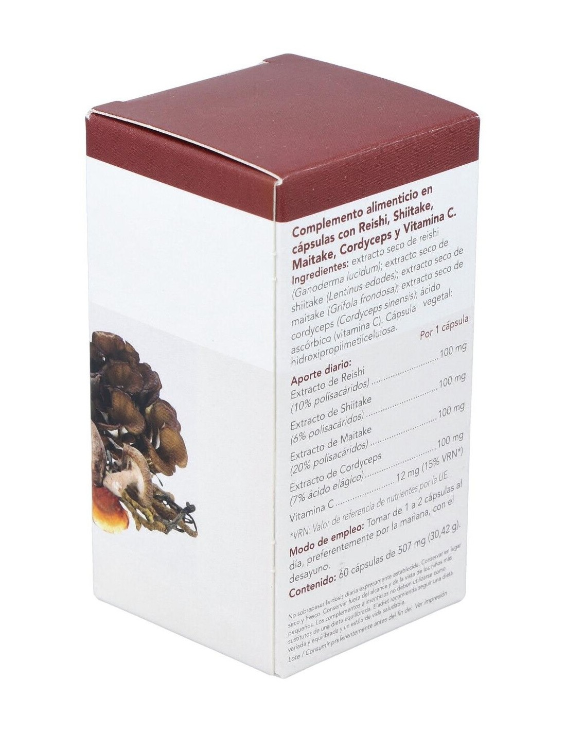 Extracto seco de reishi, extracto seco de shiitake, extracto seco de maitake, extracto seco de cordyceps, ácido ascórbico (vitamina C), hidroxipropilmetilcelulosa.
