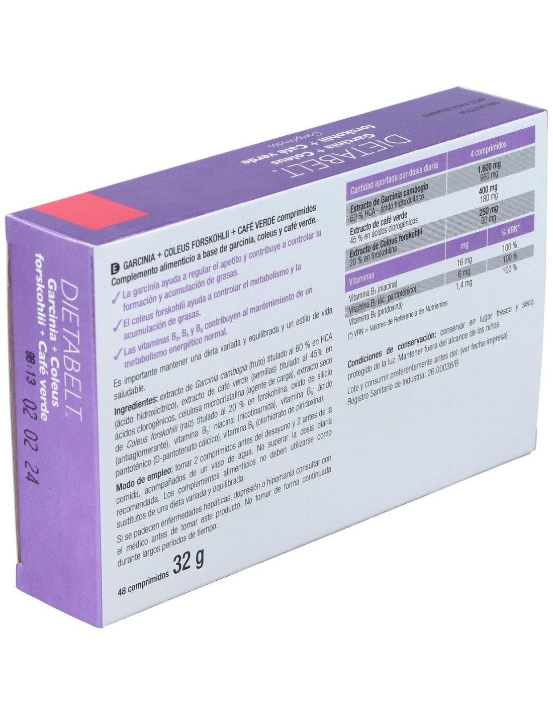 Extracto de Garcinia cambogia (fruto) titulado al 60% en HCA (ácido hidroxicítrico) extracto de café verde (semillas) titulado al 45% en ácidos clorogénicos, celulosa microcristalina (agente de carga), extracto seco de Coleus Forskohlii (raíz) titulado al 20% en forskohlina, óxido de silicio (antiaglomerante), niacina (nicotinamida), vitamina B5: ácido pantoténico (D-pantotenato cálcico), vitamina B6 (clorhidrato de piridoxina).