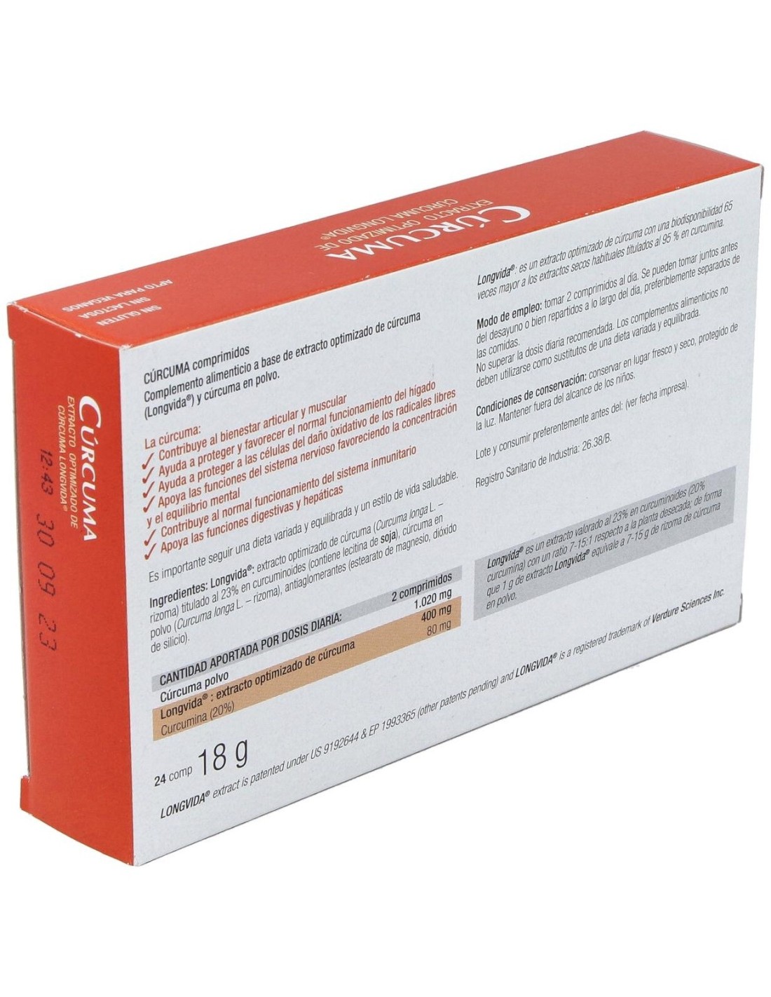 Longvida®: extracto optimizado de cúrcuma (Curcuma longa L. rizoma) titulado al 23% en curcuminoides (contiene lecitina de soja), cúrcuma en polvo (Curcuma longa L. rizoma), antiaglomerantes (estearato de magnesio, dióxido de silicio)Longvida®: extracto optimizado de cúrcuma con una biodisponibilidad 65 veces mayor a los extractos habituales titulados al 95% en curcumina.