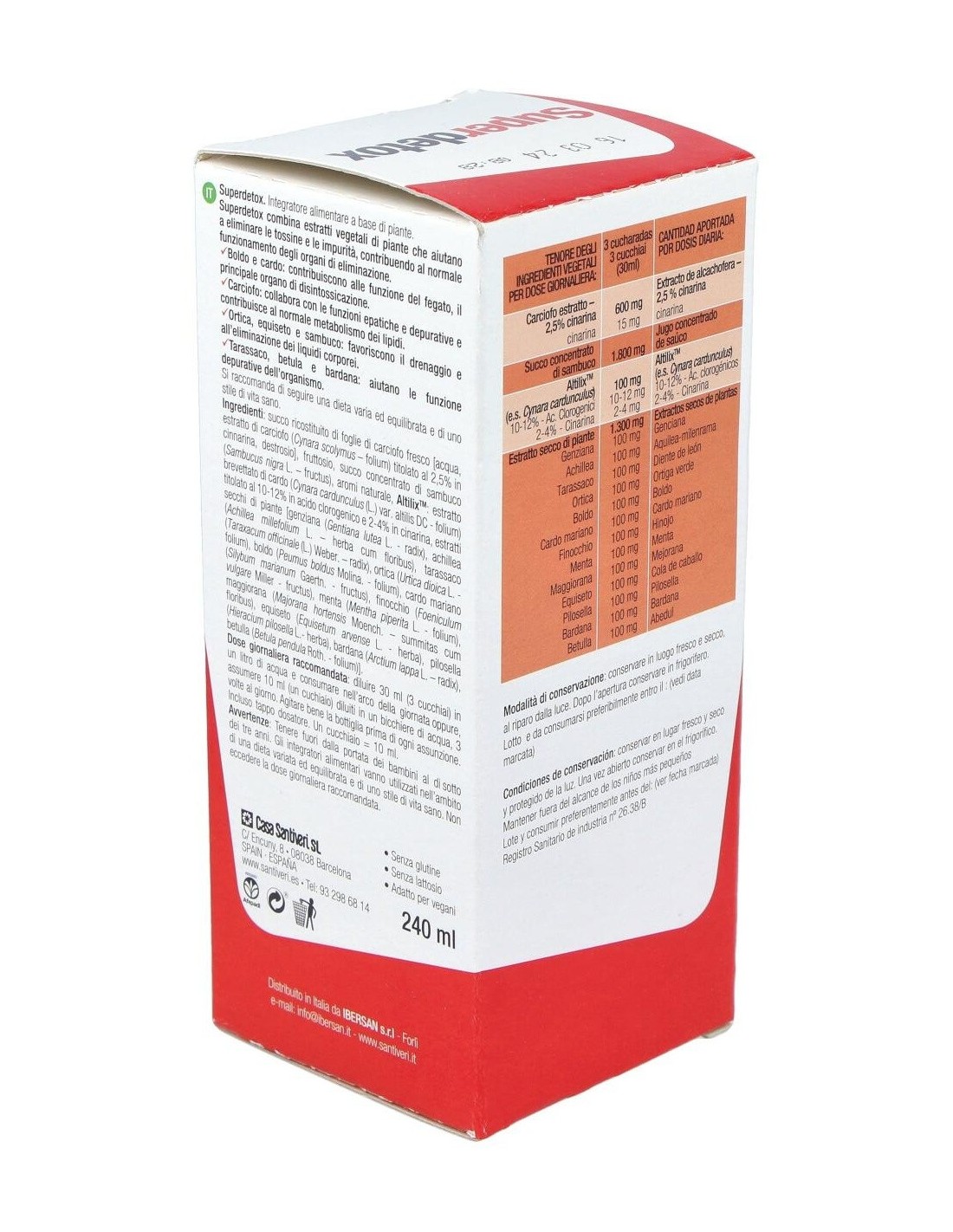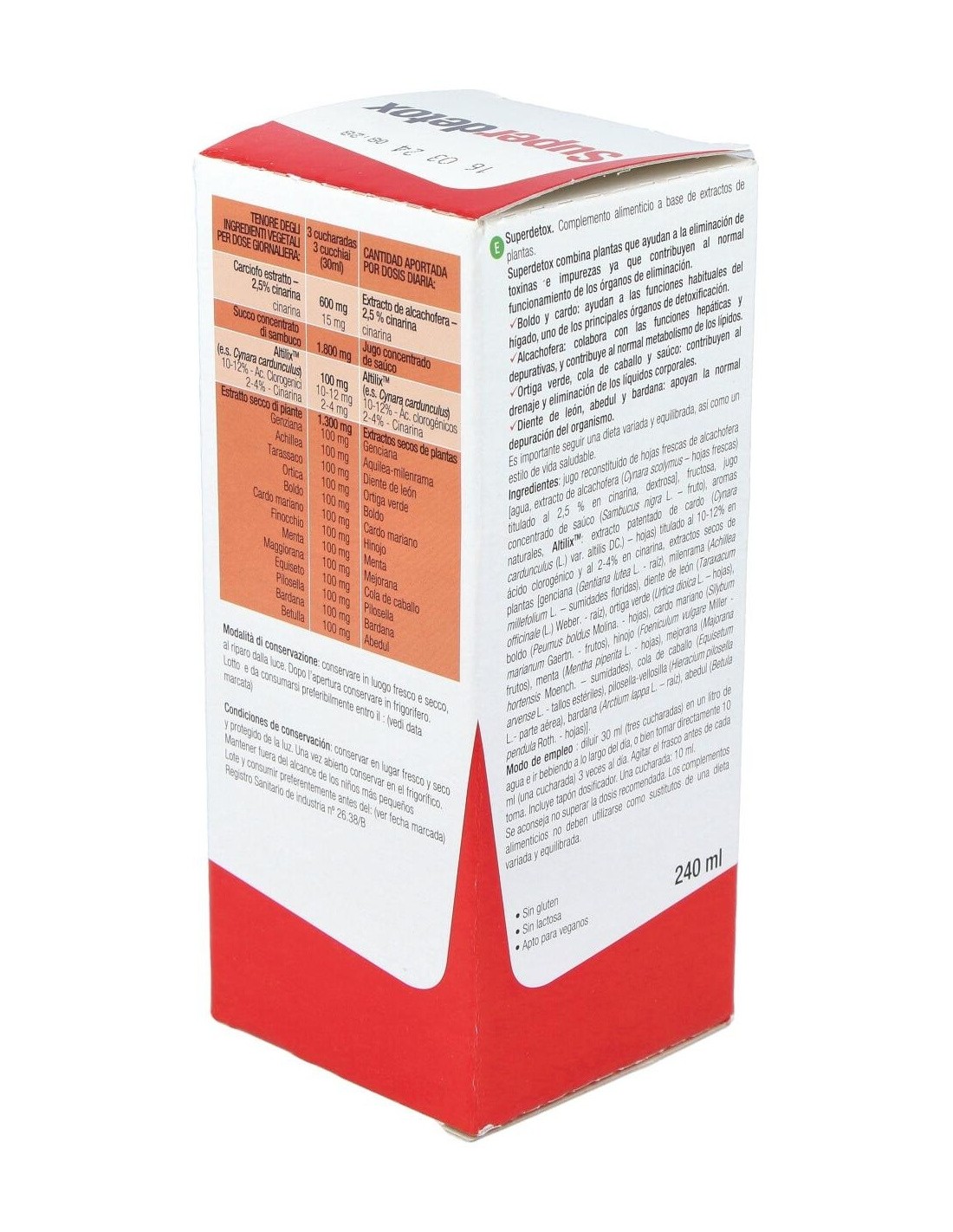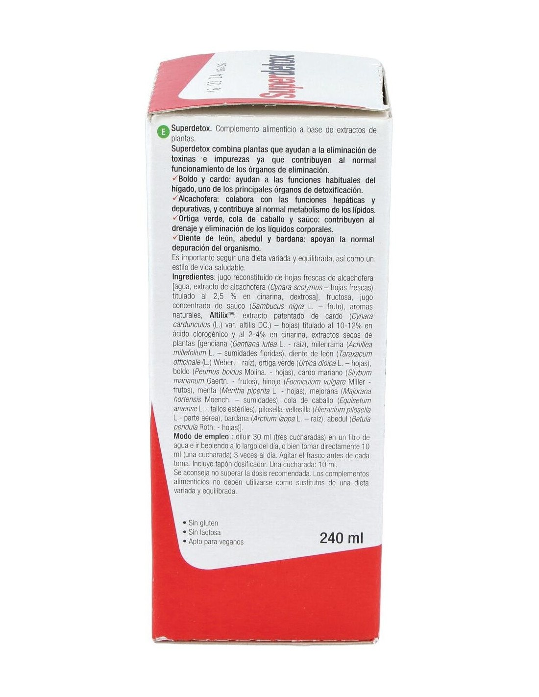 Extracto concentrado de plantas: 45,8% [genciana (Gentiana lutea L. raíz), diente de león (Taraxacum officinale Weber. planta), achillea-milenrama (Achillea millefolium L.- sumidades floridas), cúrcuma (Curcuma longa L. rizoma), boldo (Peumus boldus Molina hojas), ortiga blanca (Lamium album L. sumidad), hinojo (Foeniculum vulgare Miller fruto), manzanilla (Matricaria chamomilla L. - capítulos florales), menta (Menta piperita L. hojas), mejorana (Majorana hortensis Moench. hojas), cardo santo (Cnicus benedictus L. - planta entera), alcachofera (Cynara scolymus L. hojas), zarzaparrilla (Smilax officinalis H.B.K. raíz), saúco (Sambucus nigra L. flores), ortiga verde (Urtica dioica L. hojas), cola de caballo (Equisetum arvense L. - tallos estériles), abedul (Betula pendula Roth. hojas), bardana (Arctium lappa L. raíz), trébol de agua (Menyanthes trifoliata L. - hojas)], fructosa, extracto de alcachofera (Cynara scolymus L. hojas) titulado al 2,5% en cinarina) y aromas.