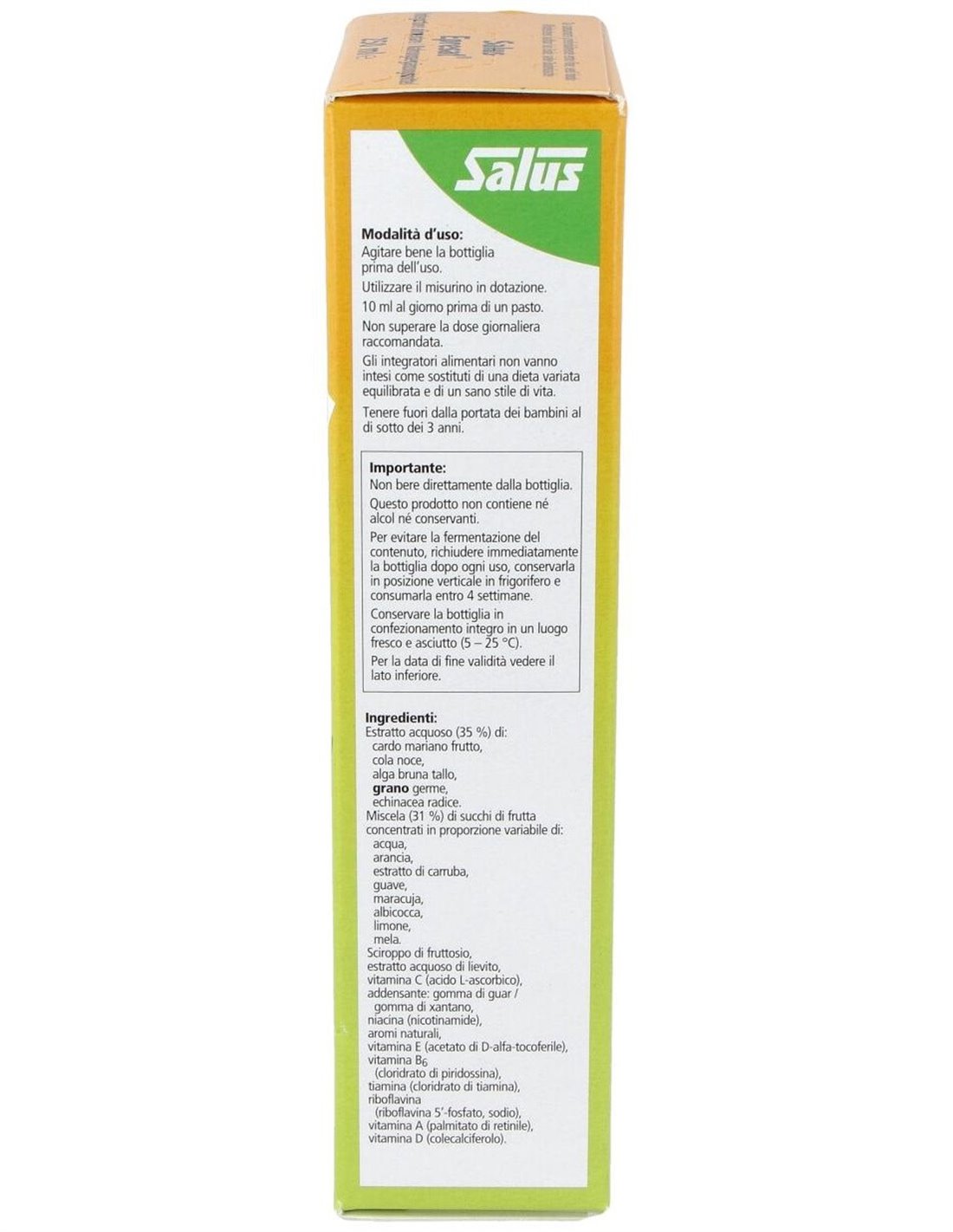 Extracto acuoso (35 %) de: frutos de cardo mariano, semillas de cola, alga marina, germen de trigo, raíz de equinácea. Mezcla de concentrados de jugos de fruta (31 %) de: agua, concentrado de jugo de naranja, maracuyá, guayaba, uva y albaricoque, extracto de algarroba, concentrados de jugo de limón y manzana. Jarabe de fructosa, extracto acuoso de levadura (Saccharomyces crevisiae), vitamina C, espesantes (goma guar, xantan), nicotinamida, aromas naturales, vitamina E, vitamina B6, vitamina B1, vitamina B2, vitamina A, vitamina D.