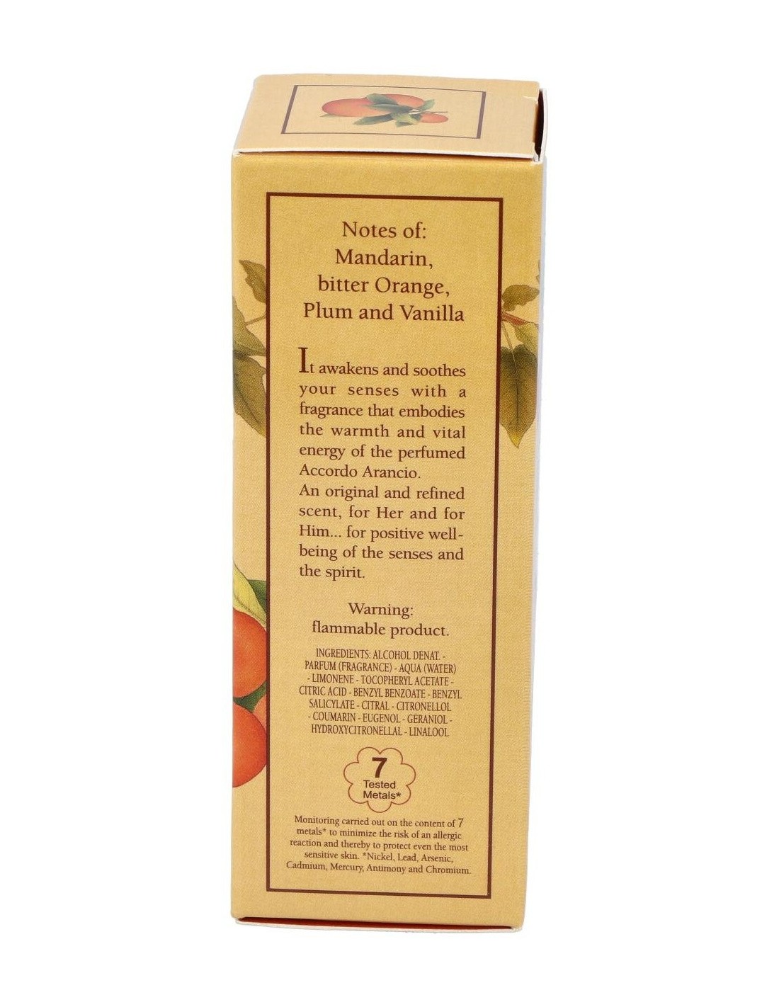 Alcohol denat., Parfum (Fragrance), Aqua (Water), Limonene, Tocopheryl acetate, Citric acid, Benzyl benzoate, Benzyl salicylate, Citral, Citronellol, Coumarin, Eugenol, Geraniol, Hydroxycitronellal, Linalool.