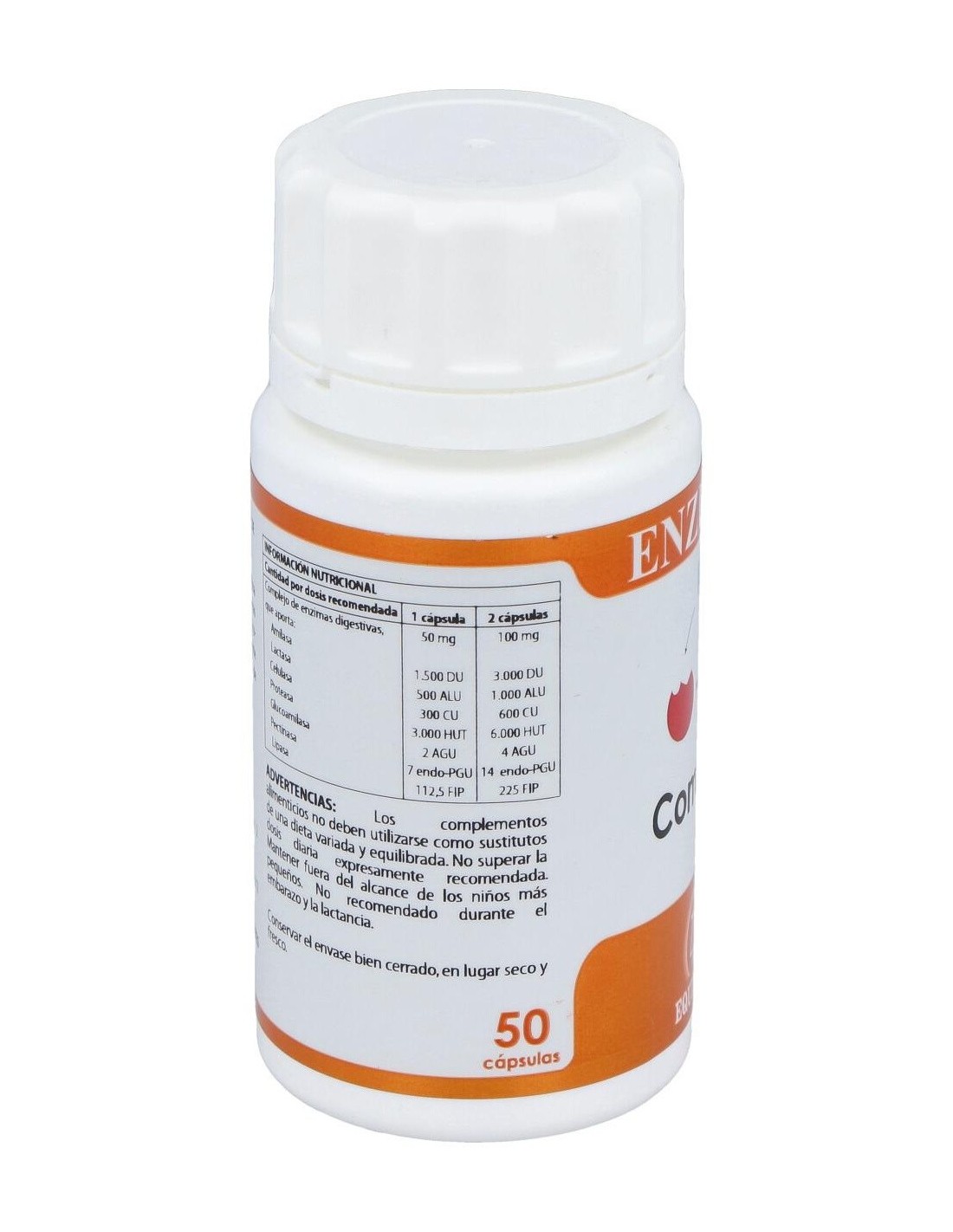 Mezcla de enzimas digestivas (amilasa 1.500 DU, proteasa 3.000 HUT, glucoamilasa 2 AGU, lipasa 112,50 FCC FIP, celulasa 300 CU, lactasa 500 ALU, pectinasa 7 endo PGU.), 50 mg. Envoltura: polisacárido de origen vegetal (pululano).