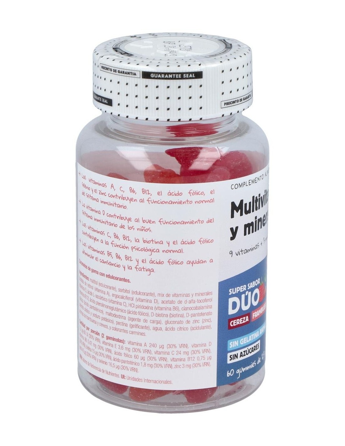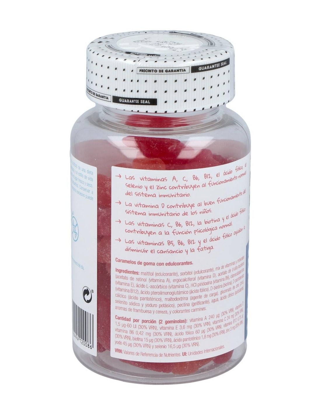 Gominolas para niños con sabor a cereza y frambuesa. Las vitaminas A, C, B6, B12, el ácido fólico, el selenio y el zinc contribuyen al funcionamiento normal del sistema