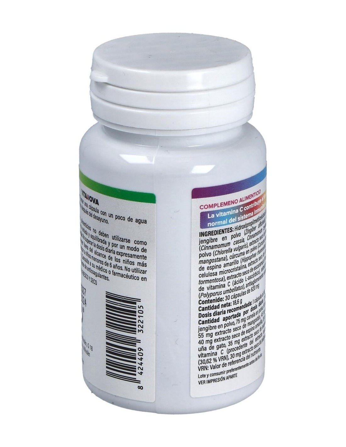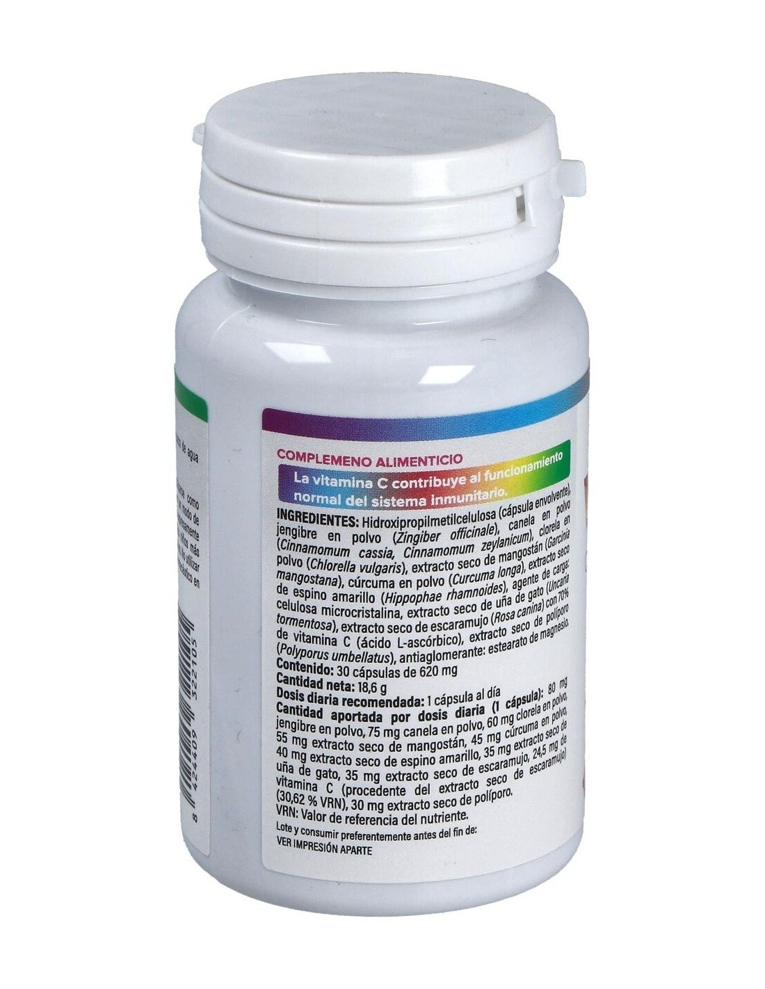 Hidroxipropilmetilcelulosa, jengibre en polvo, canela en polvo, clorela en polvo, extracto seco de mangostán, cúrcuma en polvo, extracto seco de espino amarillo, celulosa microcristalina, extracto seco de uña de gato, extracto seco de escaramujo con 70% de vitamina C (ácido L-ascórbico), extracto seco de políporo, estearato de magnesio.