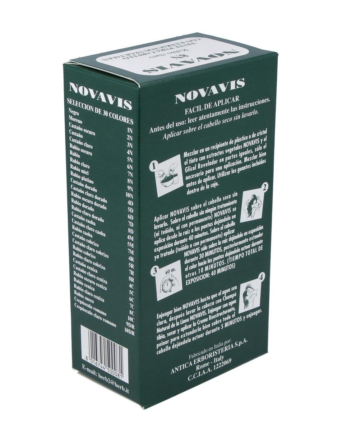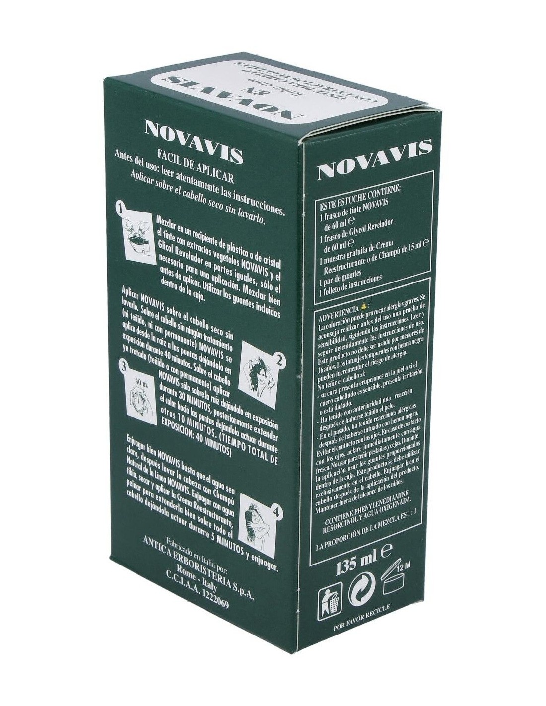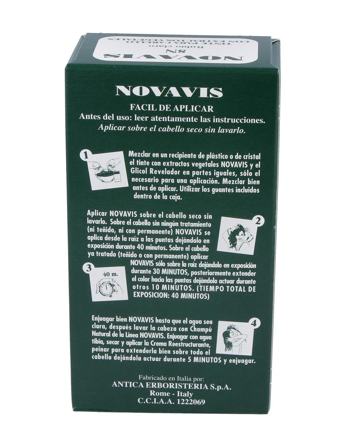 1. Mezclar en un recipiente de plástico o de cristal el tinte con extractos vegetales y el Glicol Revelador en partes iguales, sólo el necesario para una aplicación. Mezclar bien antes de aplicar. Utilizar los guantes incluidos dentro de la caja. 2. Aplicar sobre el cabello seco sin lavarlo. Sobre el cabello sin tratamiento ( ni teñido ni permanente). Se aplica desde la raíz a las puntas dejándolo en exposición durante 40 minutos. Sobre el cabello con teñido o permanente. Aplicar sólo sobre la raíz dejándolo en exposición durante 30 minutos. Posteriormente extender el color hacia las puntas dejándolo actuar durante otros 10 minutos. El tiempo total de exposición es de 40 minutos. 3. Enjuagar bien hasta que el agua sea clara, después lavar la cabeza con Champú Natural de Línea Novavis. Enjuagar con agua tibia, secar y aplicar la Crema Reestructurante, peinar para extenderla bien sobre todo el cabello dejándola actuar durante 5 minutos y enjuagar.