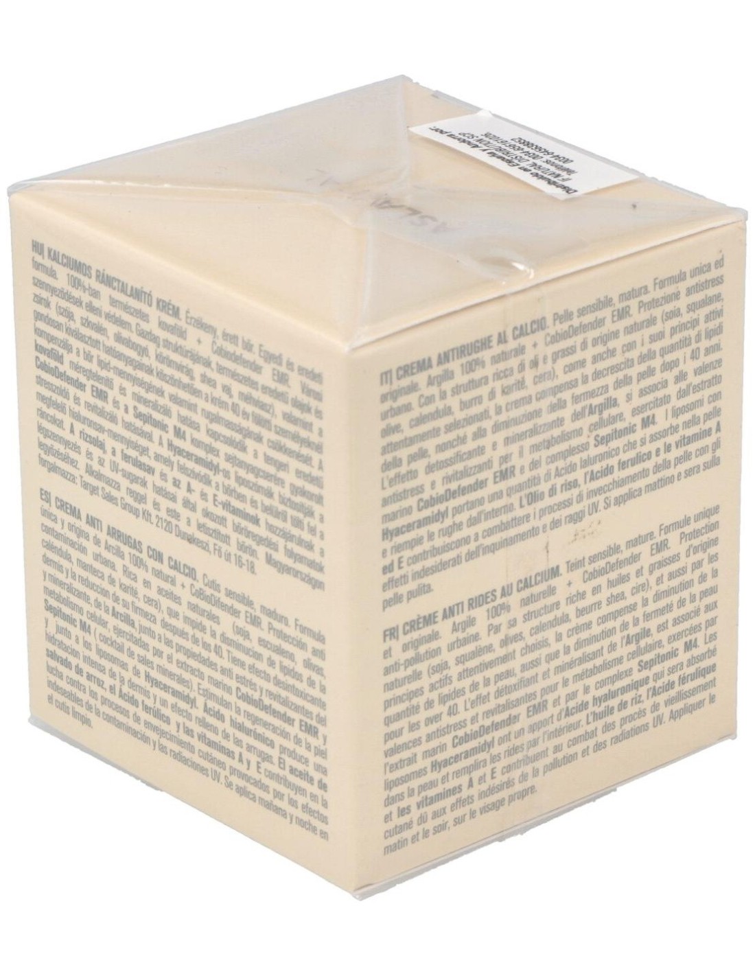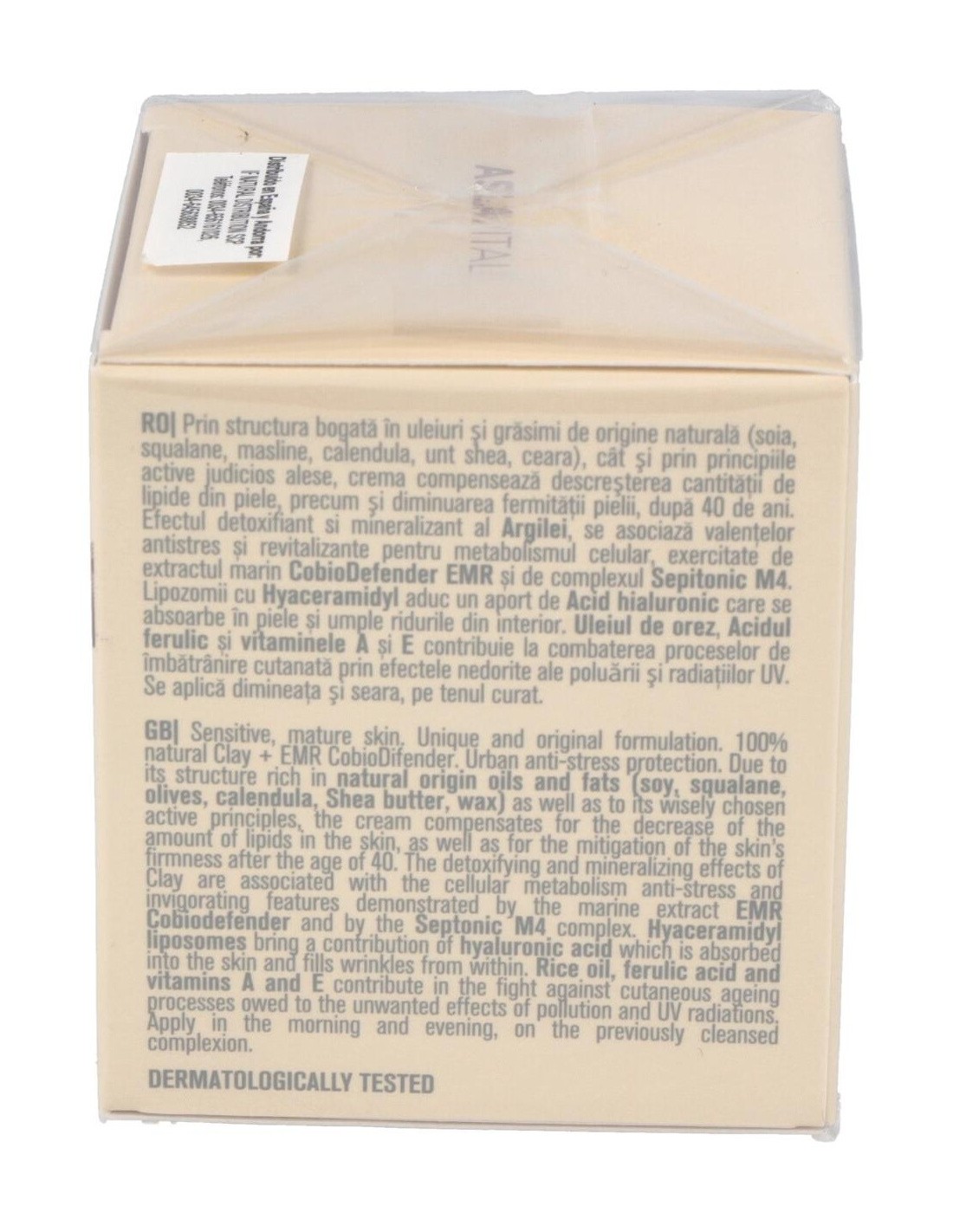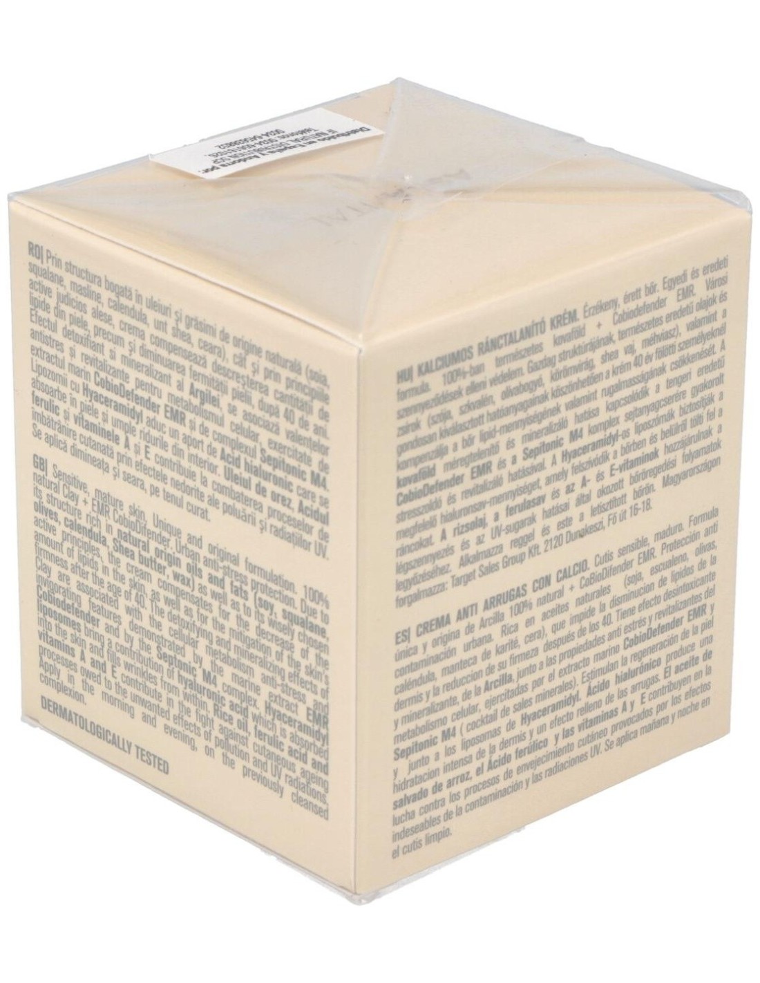 Aceites y grasas de origen natural (soja, escualeno, olivas, caléndula, manteca de karité, cera), arcilla, extracto marino CobioDefender EMR, complejo Sepitonic M4 (coctail de sales minerales), liposomas con Hyaceramidyl, aceite de arroz, ácido ferúlico, vitaminas A y E, otros.