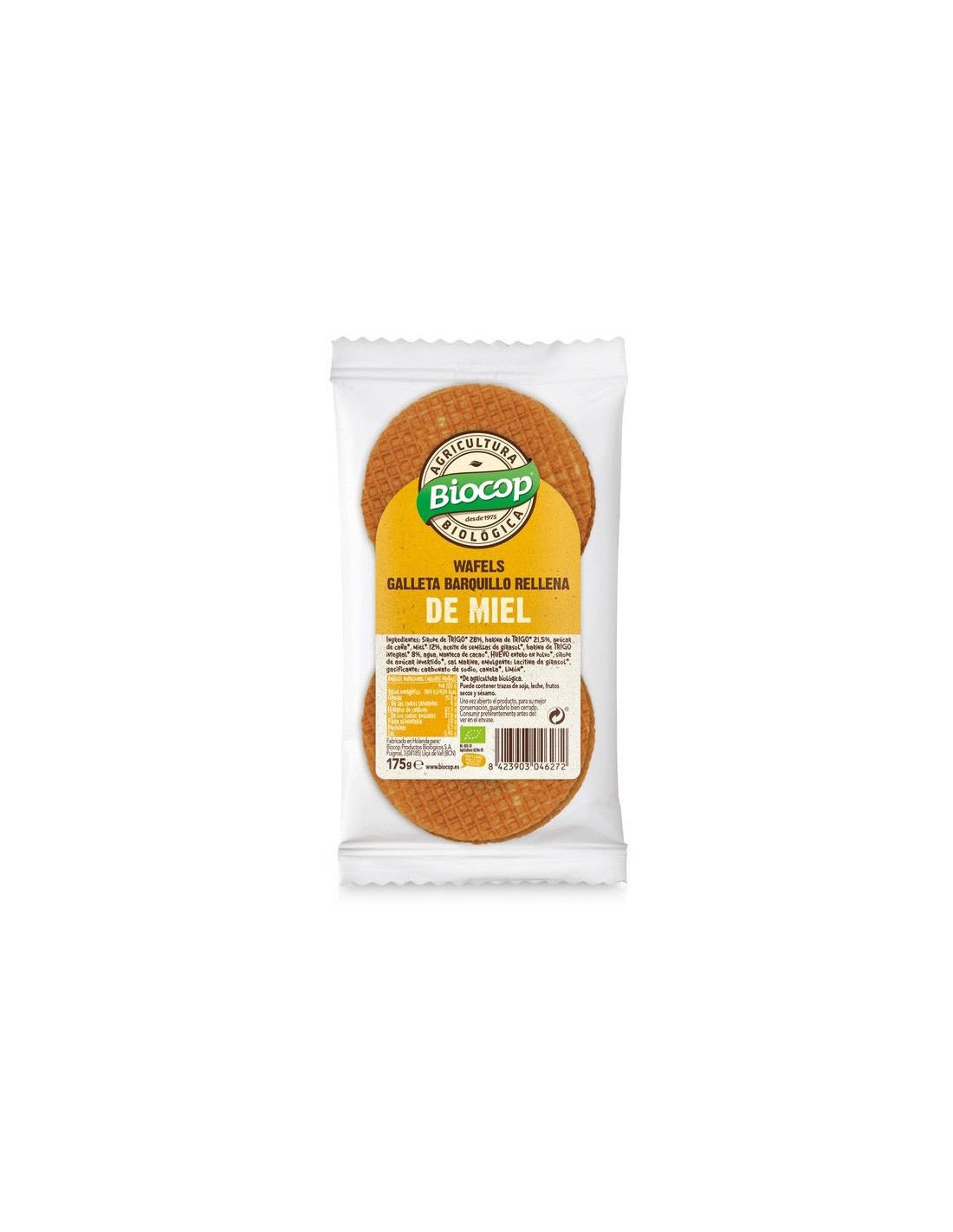 Las wafels de miel de Biocop son galletas crujientes que están elaboradas con harina de trigo integral y miel, y endulzadas con siropes de maíz y trigo. Todos sus ingredientes son procedentes de cultivos ecológicos, de modo que no han sido tratados con pesticidas ni otros químicos dañinos para el ser humano. Se trata de un desayuno o merienda nutritivo e ideal para personas de cualquier edad, aunque por su elevado valor energético son especialmente apropiadas para los niños.