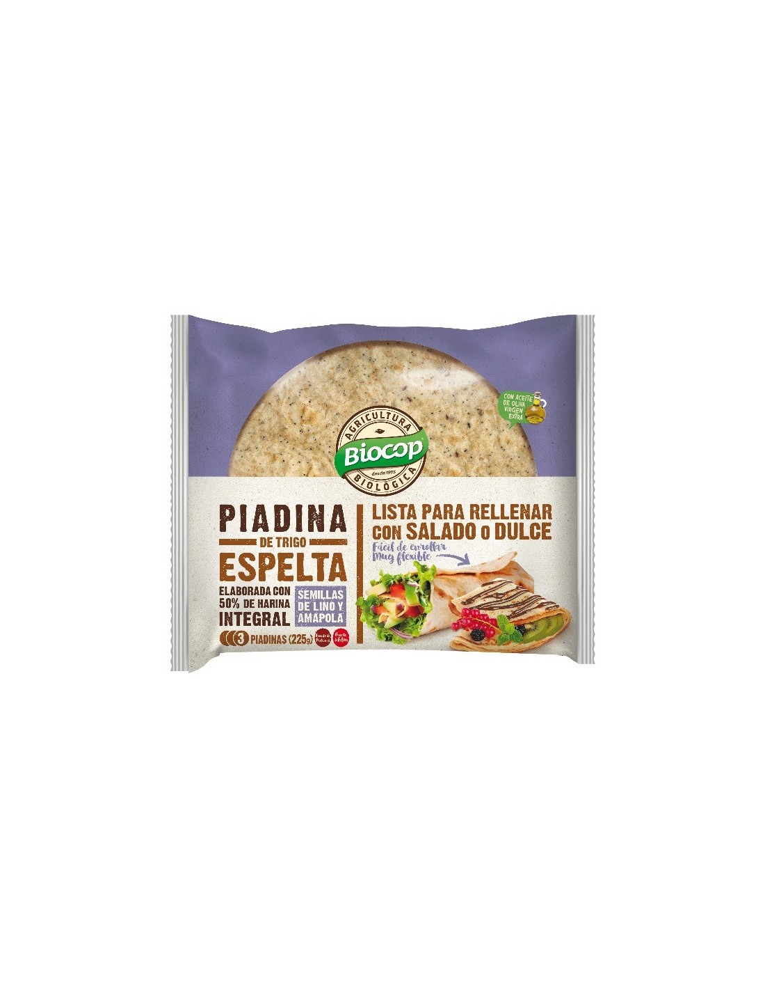 3 Piadinas elaboradas con mezcla de harinas integral y blanca de trigo espelta y semillas de lino y de amapola. Ideal prepararla en sartén y rellenarla con ingredientes dulces o bien salados. Elaborada con aceite de oliva virgen extra. No contiene leche ni derivados. Apto para veganos.
