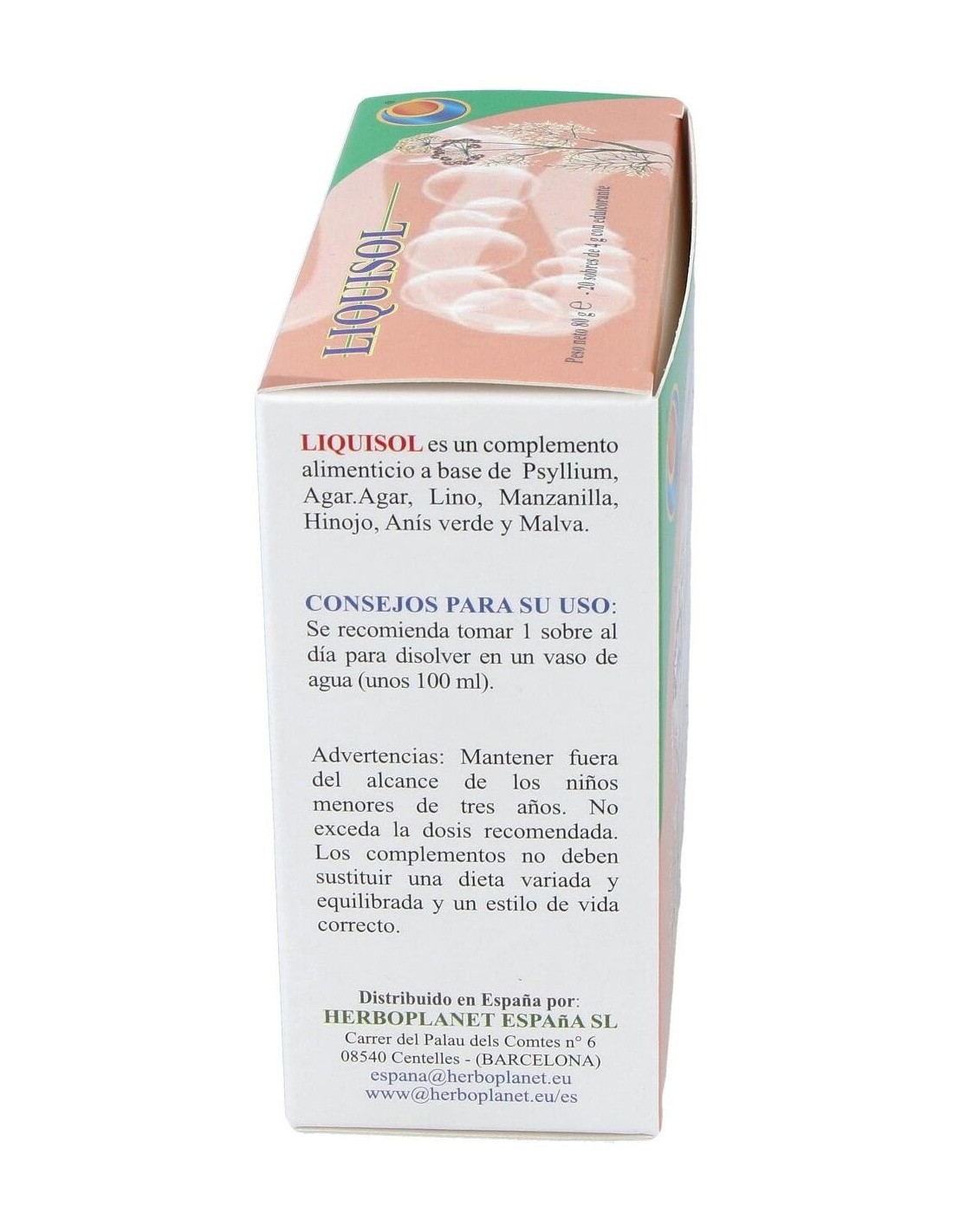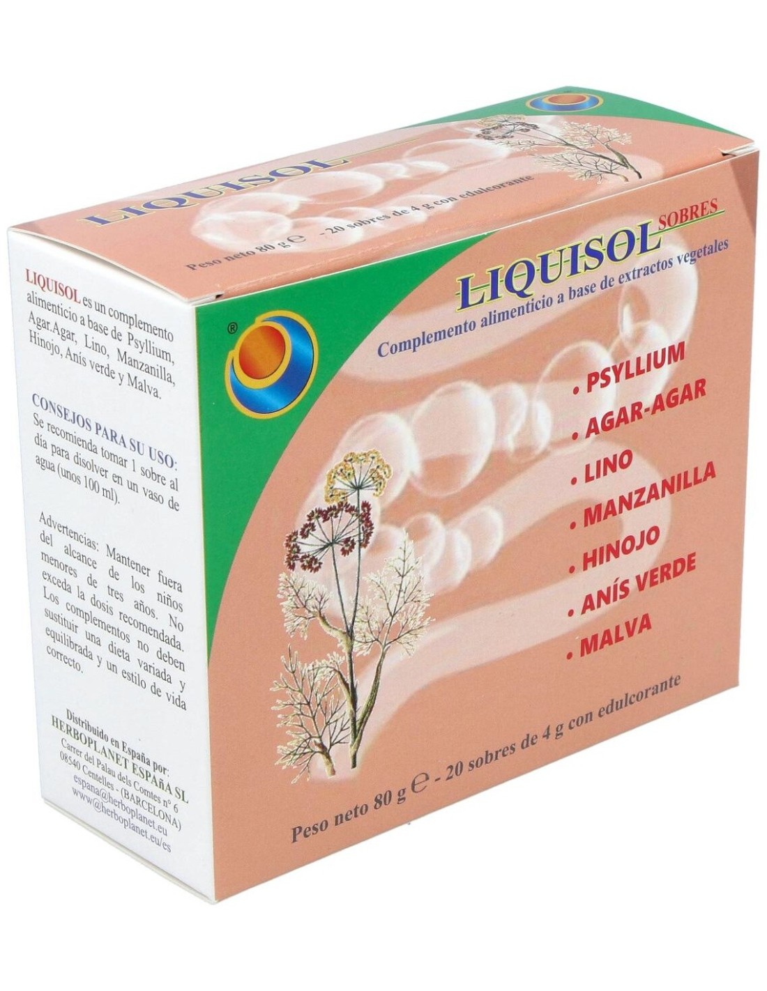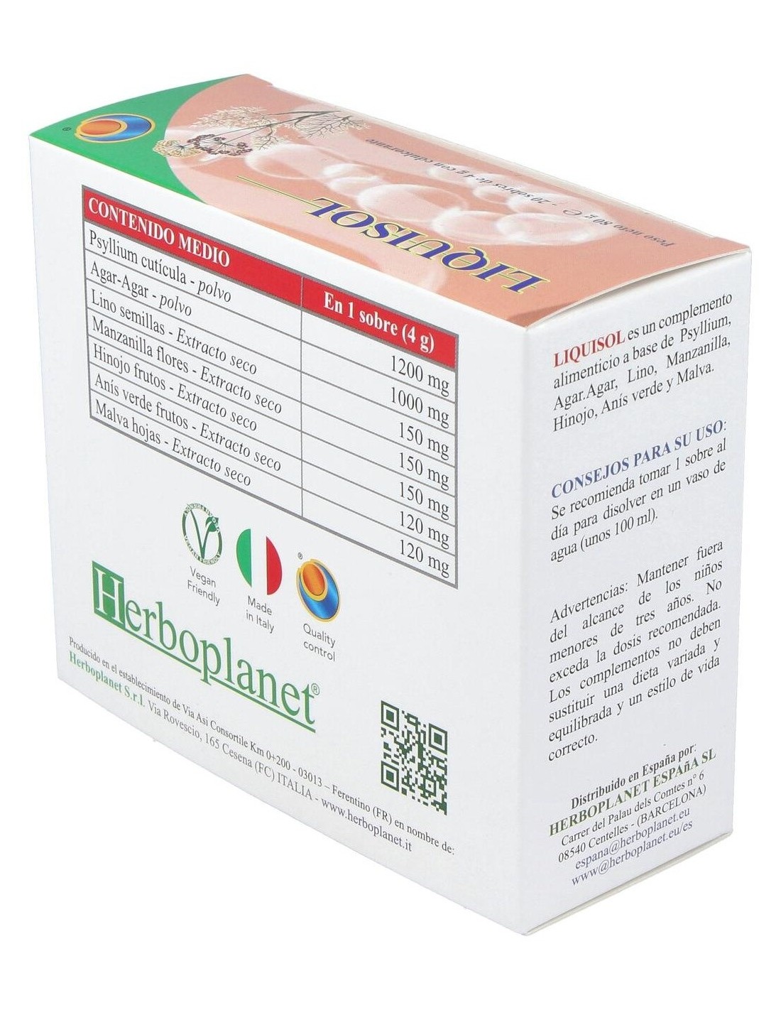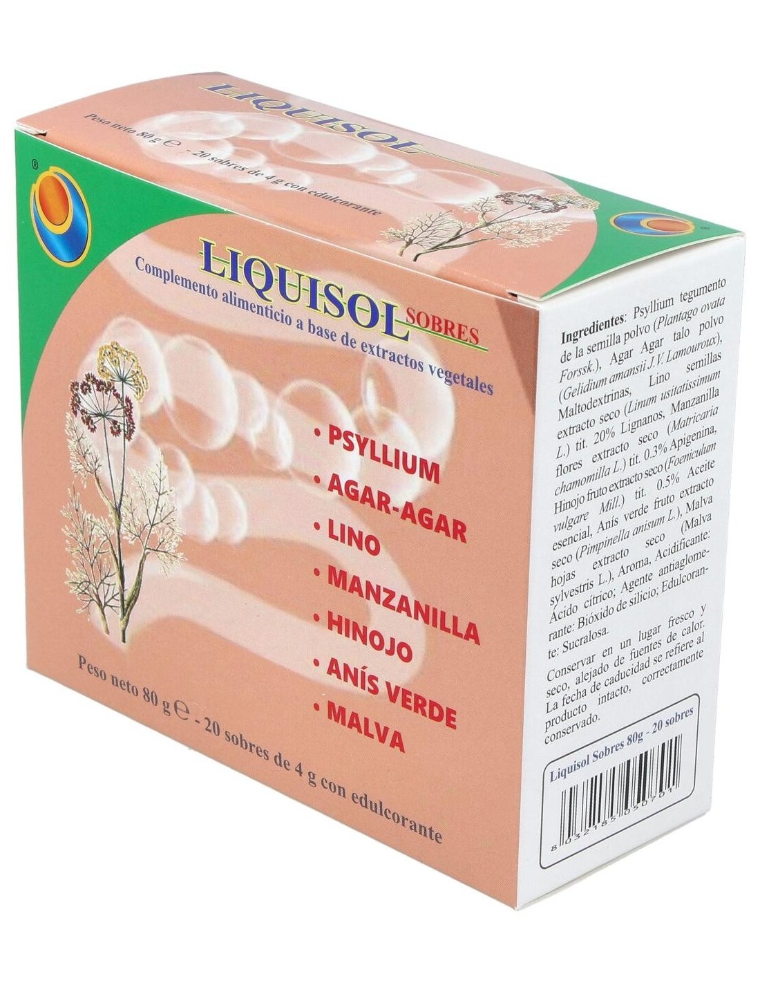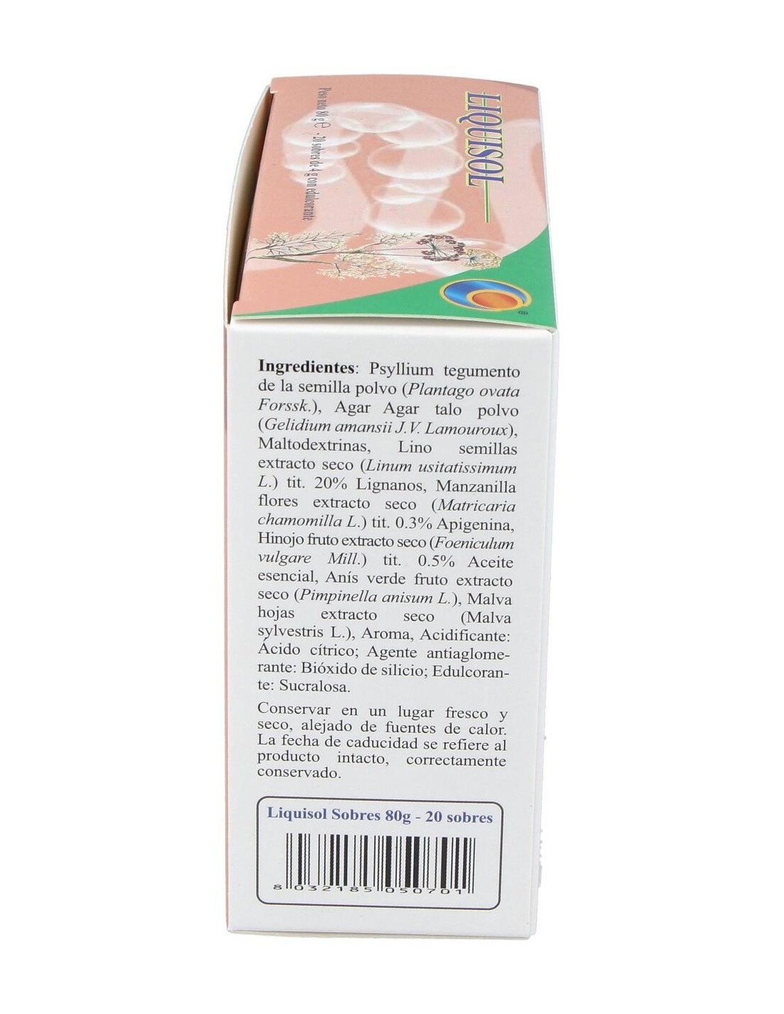 Psyllium tegumento de la semilla polvo (Plantago ovata Forssk.) 1,2 g, Agar Agar talo polvo (Gelidium amansii J.V. Lamouroux) 1 g, Maltodextrinas, Lino semillas extracto seco (Linum usitatissimum L.) 150 mg, titulado 20% en Lignanos, Manzanilla flores extracto seco (Matricaria chamomilla L.) 150 mg, titulado 0.3% en Apigenina, Hinojo fruto extracto seco (Foeniculum vulgare Mill.) 150 mg, titulado 0.5% en Aceite esencial, Anís verde fruto extracto seco (Pimpinella anisum L.) 120 mg, Malva hojas extracto seco (Malva sylvestris L.) 120 mg. Aroma. Acidificante: Ácido cítrico. Agente antiaglomerante: Bióxido de silicio. Edulcorante: Sucralosa.