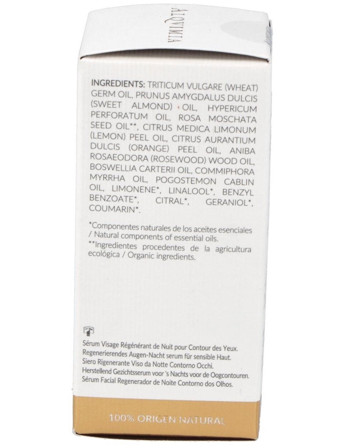 Triticum vulgare (wheat) germ oil, prunus amygdalus dulcis (sweet almond) oil, hypericum perforatum oil, rosa moschata seed oil, citrus medica limonum (lemon) peel oil, citrus aurantium dulcis (orange) peel oil, aniba rosaeodora (rosewood) wood oil, boswellia carterii oil, commiphora myrrha oil, pogostemoncablin oil, limonene*, linalool*, benzyl, benzoate*, citral*, geraniol*, coumarin*