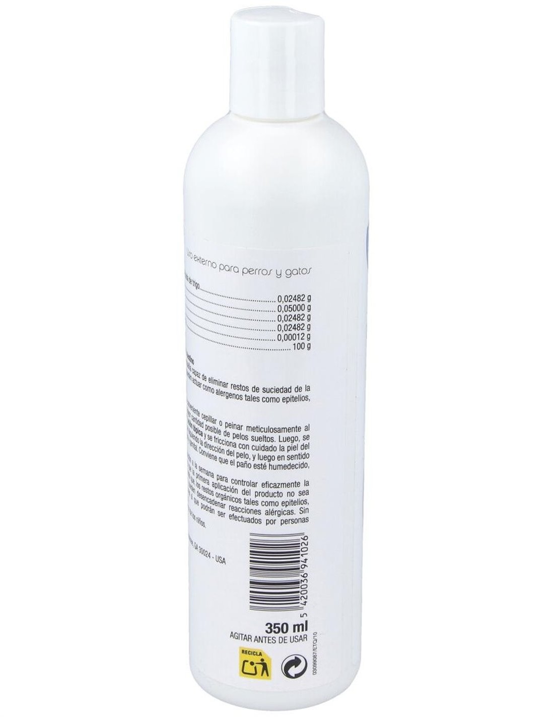 Solución tópica para reducir los casos de alergia a las mascotas (perros y gatos). Consigue eliminar restos de suciedad de la superficie, incluyendo aquellos que pueden actuar como alérgenos tales como epitelios, restos de saliva y orina, etc.