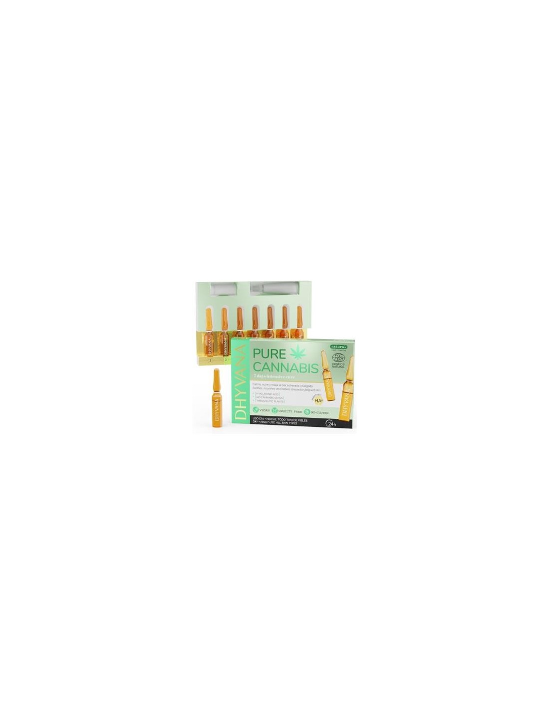 Ampollas ultra-concentradas con Ácido Hialurónico, Cannabis Sativa ECO y Botánicos Terapéuticos calmantes de Aloe Vera, Camomila y Cola de Caballo. Ayudan a calmar, nutrir y relajar la piel estresada o fatigada. Este producto está certificado COSMOS NATURAL por la entidad independiente ECOCERT Greenlife, garantizando que el 100% de los ingredientes son de origen natural, con producción y prácticas agrícolas sostenibles y sin crueldad animal.