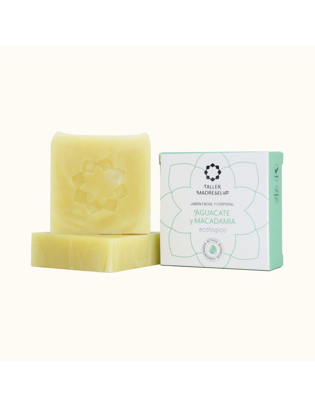 Jabón Facial y Corporal de Aguacate y Macadamia 100% Ecológico formulado para limpiar, nutrir y suavizar la piel. Es adecuado para pieles secas. Los Activos Botánicos Concentrados ecológicos Manteca de Karité, Aceite de Coco, Aceite de Oliva, Aceite de Aguacate y Aceite de Macadamia alivian la sequedad de la piel, suavizan las rojeces y evitan la tirantez que, típicamente, producen los cambios de temperatura