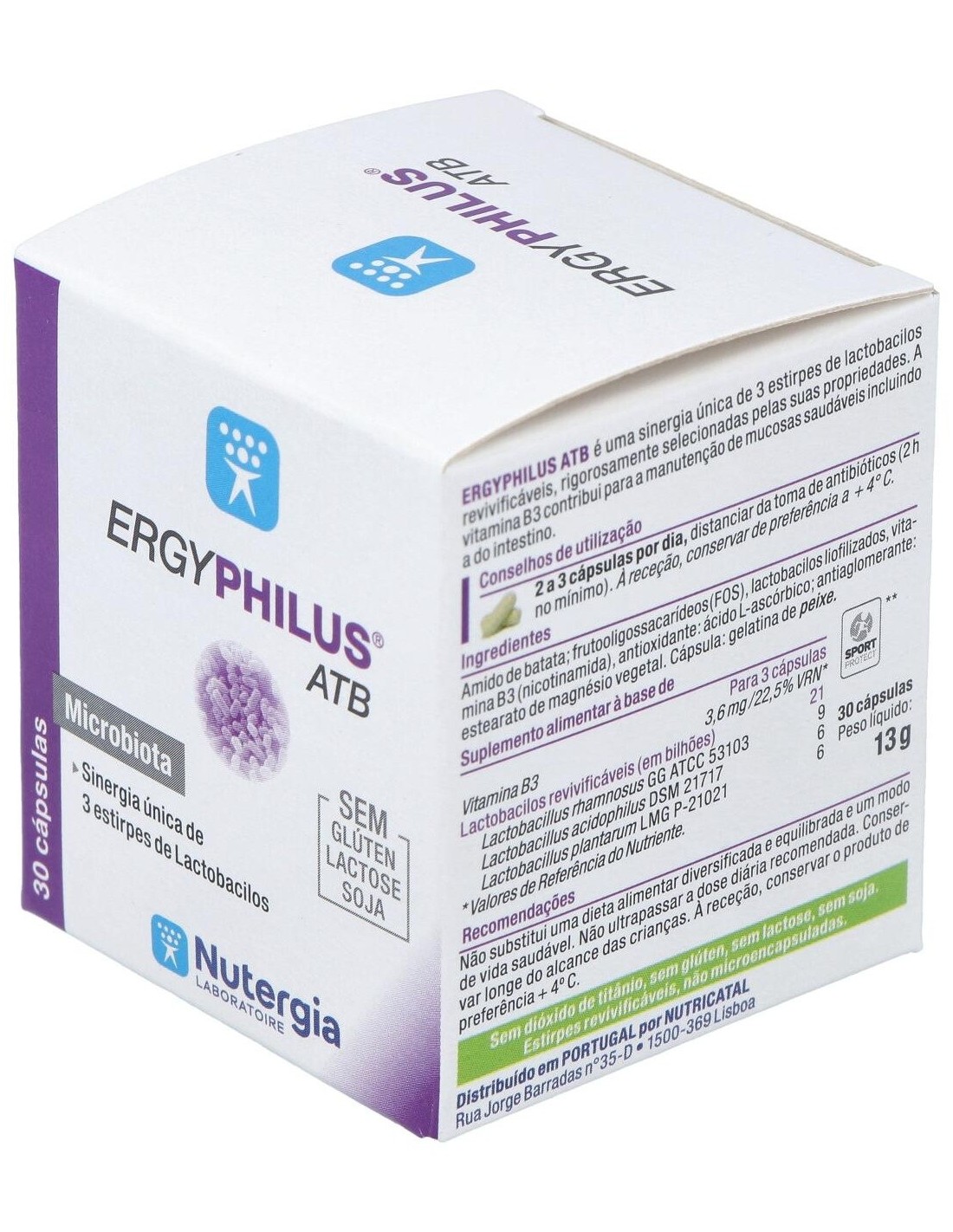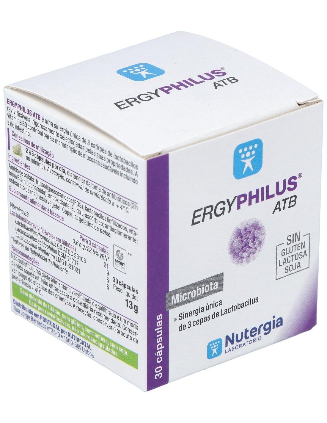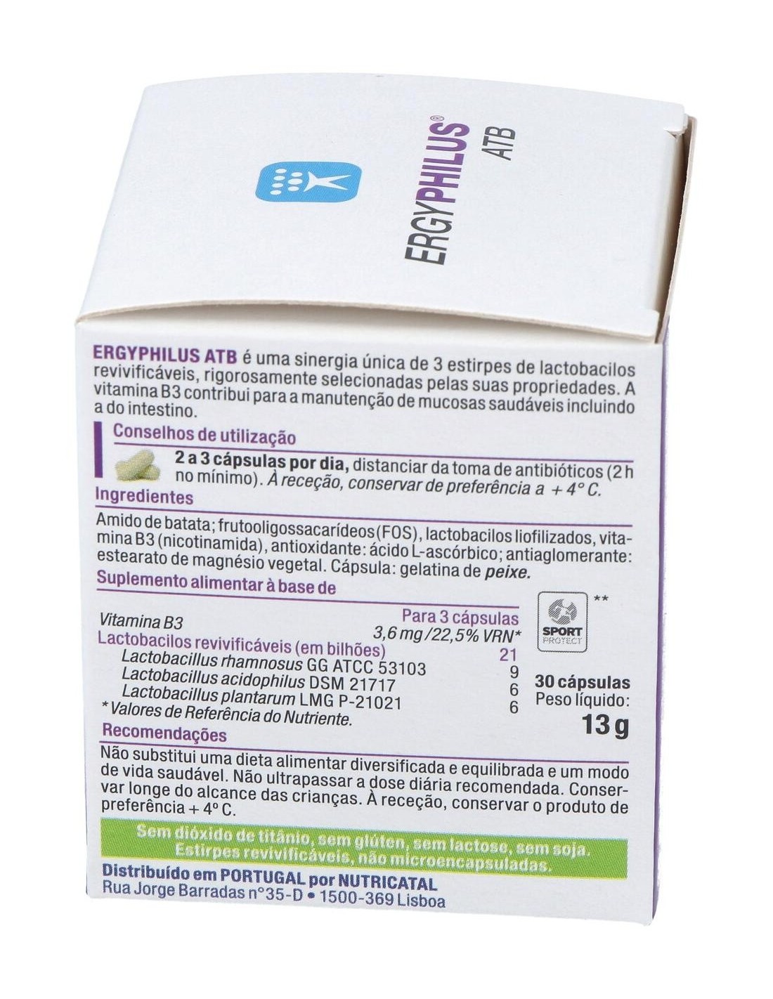 Almidón de patata, fructo oligosacáridos (FOS), lacto bacilos liofilizados, vitamina B3 (nicotinamida), antioxidante: ácido L-ascórbico: antiaglomerante: estearato de magnesio vegetal. Cápsula: gelatina de pescado.
