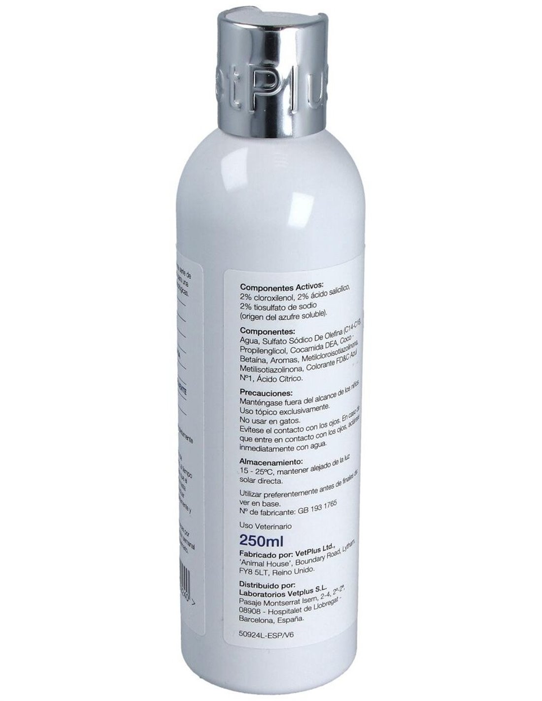 Ingredientes activos: 2% cloroxilenol, 2% ácido salicílico, 2% tiosulfato de sodio (origen del azufre soluble)
