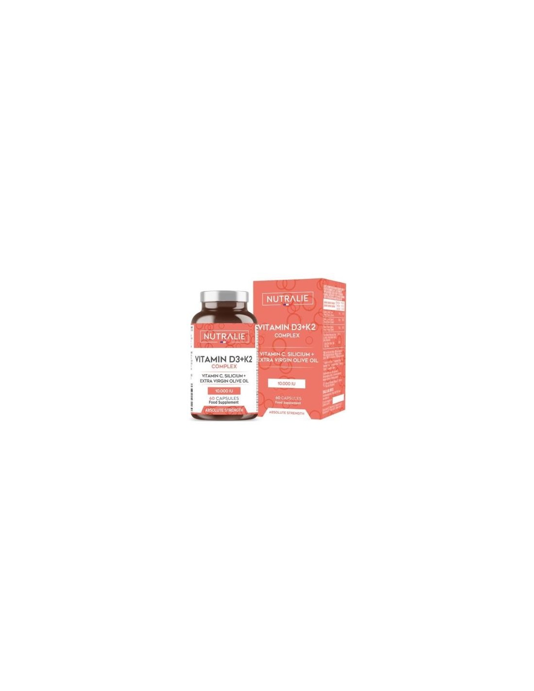 Producto que contiene vitamina D3 (colecalciferol) en 10.000 UI y vitamina K2 (menaquinona) del tipo MK-7, ambas en una dosis altamente concentrada. La fórmula se completa con la vitamina C, aceite de oliva virgen extra y extracto de bambú. Además, esta fórmula es única gracias a la vitamina K2 ya que contiene un 5% de aceite de triglicéridos de cadena media (MCT). Las vitaminas D y C actúan en sinergia y contribuyen a la formación normal de colágeno para el funcionamiento normal de los huesos, vasos sanguíneos y cartílagos. Además, la vitamina D también contribuye al funcionamiento normal de los músculos.