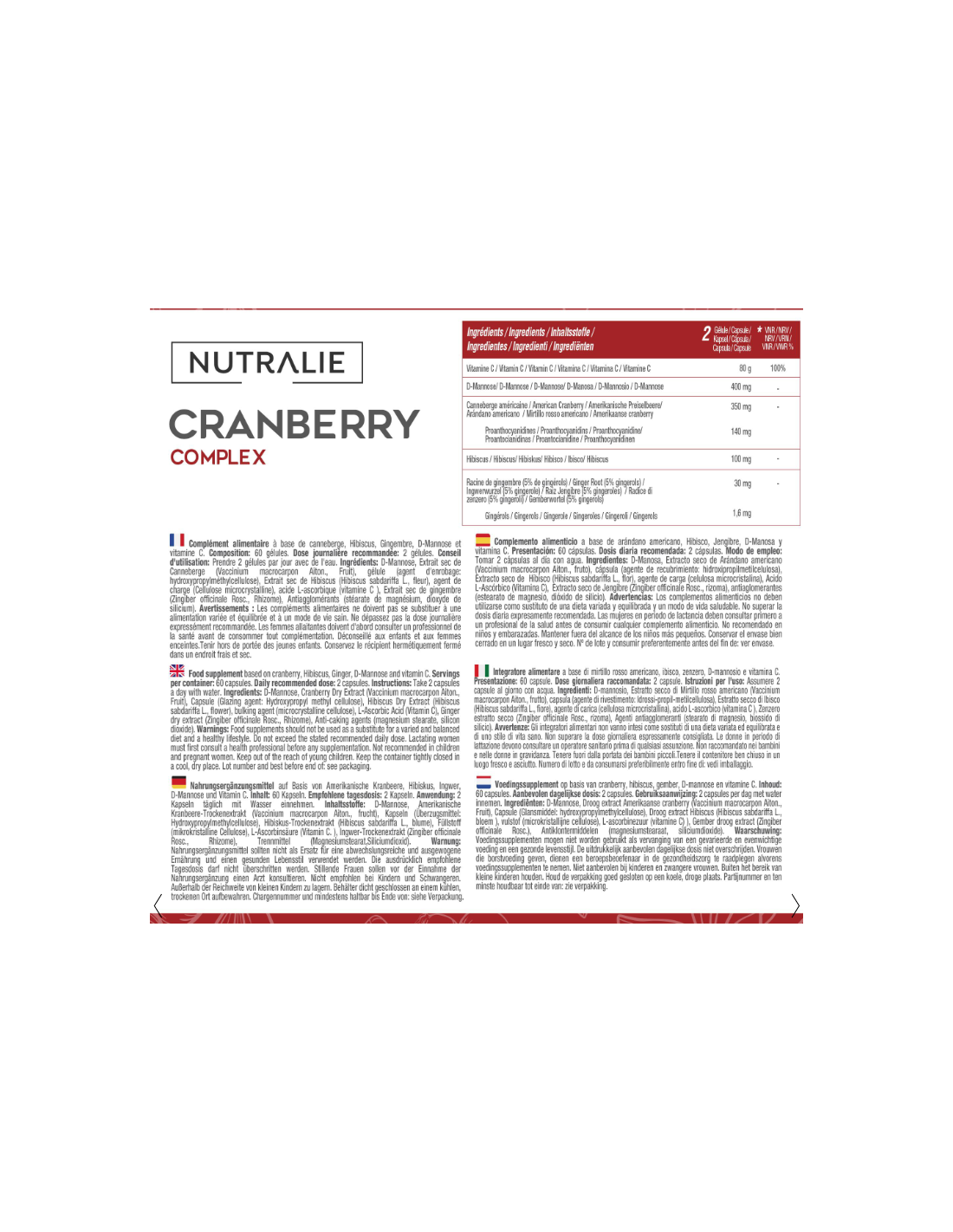 D-Manosa, E.S Arándono americano (Vaccinium macrocarpon Aiton., fruto), agente de recubrimiento (hidroxipropilmetilcelulosa), E.S Híbisco (Hibiscus sabdariffa L., semillas), agente de carga (celulosa microcristalina), Ácido L-Ascórbico (Vitamina C), Raíz Jengibre (Zingiber officinale Rosc.), antiaglomerantes (estearato de magnesio, dióxido de silicio).