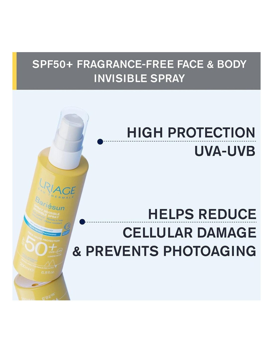 Combina un complejo de filtros de muy alto rendimiento y dos patentes dermatológicas para proteger la piel, prevenir el daño celular y el fotoenvejecimiento causado por los rayos UVA y UVB y la luz azul. Este spray de muy alta protección con una textura ligera garantiza un acabado invisible cada vez que se aplica. Este producto de protección solar proporciona una alta seguridad y una alta tolerancia.