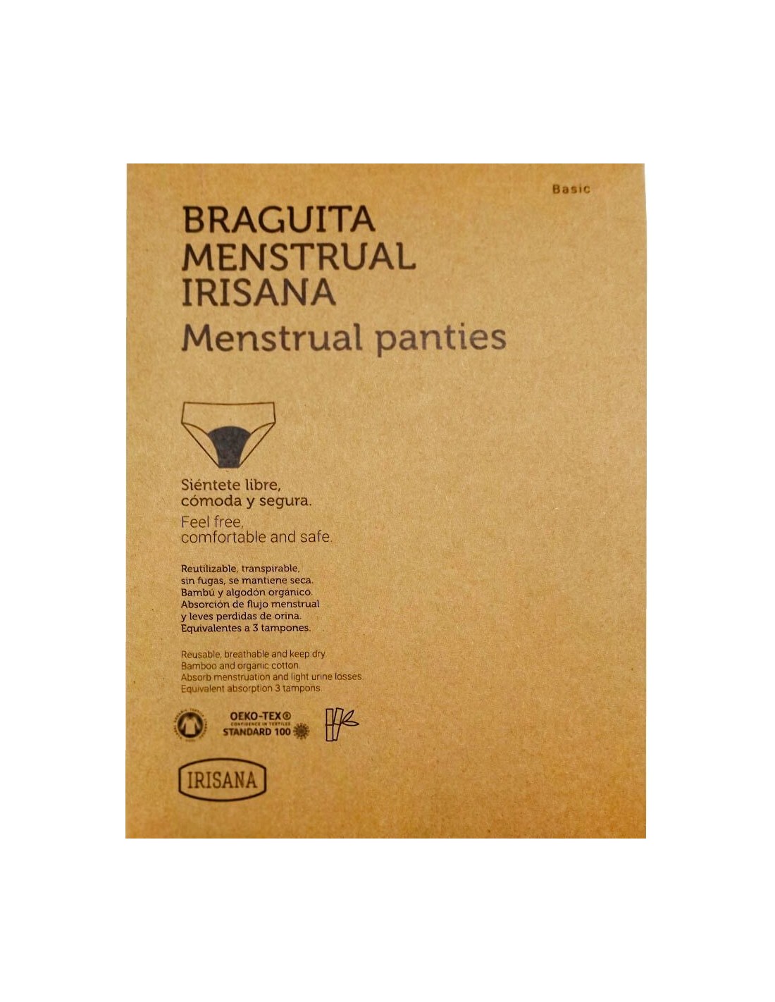 Absorbe el flujo menstrual y pequeñas pérdidas de orina (equivalente a 3 tampones). Sin olores, sin humedad, sin fugas, transpirable. 4 capas de protección. Fabricada con bambú y algodón orgánico, respetuosas con el cuerpo y con el medio ambiente.
