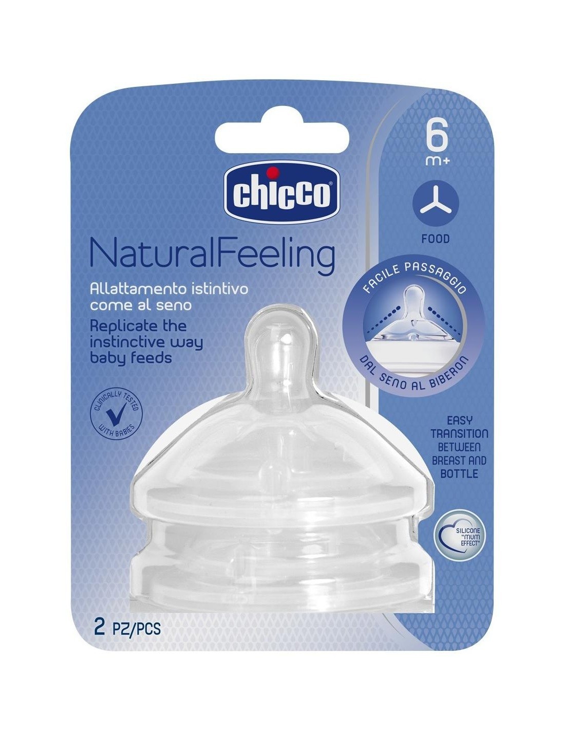 CHICCOTetina alargada y base redondeada anticólicos para biberones NaturalFeeling. Se recomienda a partir de los 6 meses, cuando se introduce la alimentación en papilla o leche con cereales. Tiene una base menos abombada específica para el apoyo labial. Los relieves de la base imitan el pecho materno y aumentan la elasticidad y flexibilidad de la tetina.