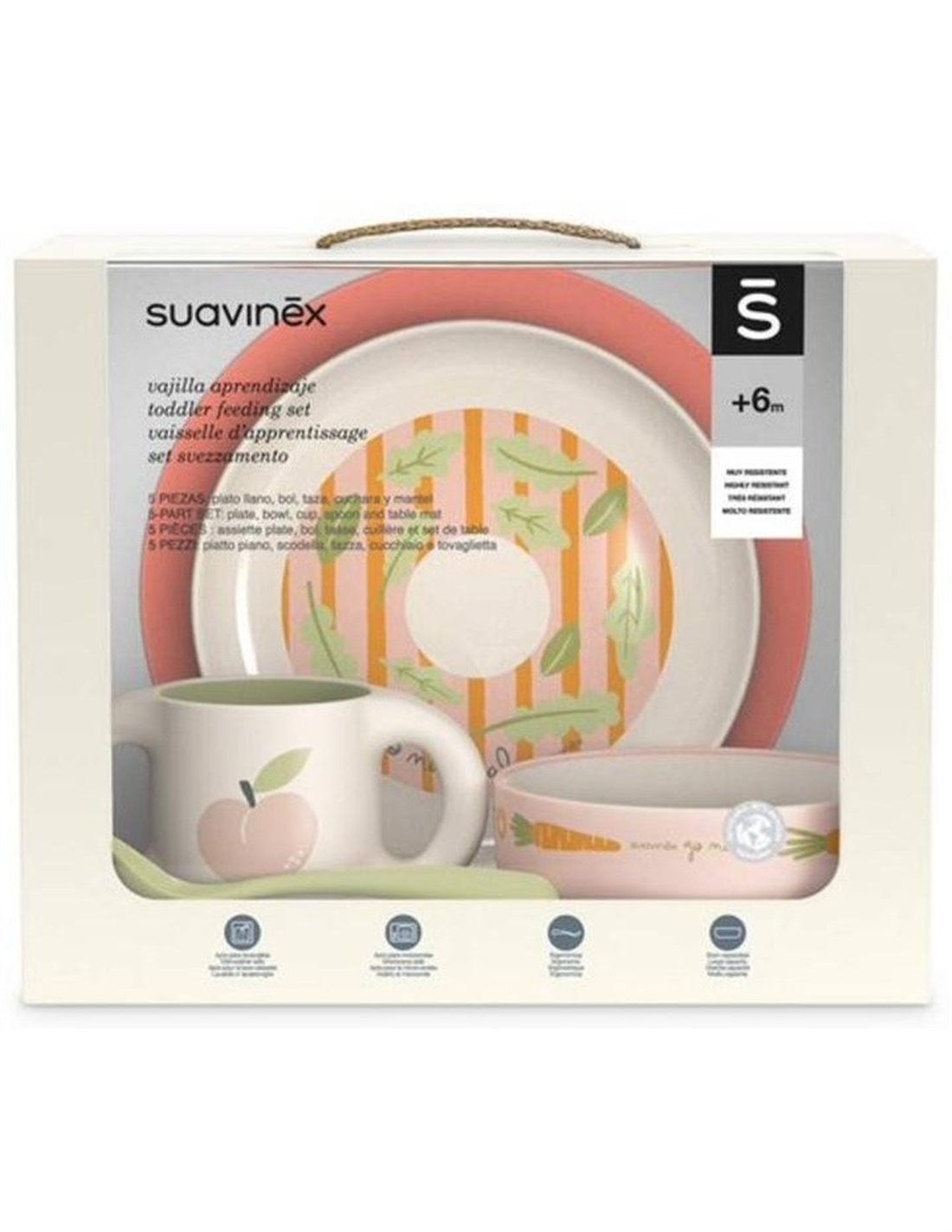 SUAVINEXVajilla aprendizaje pensada para facilitar la alimentación del bebé. Compuesta por plato llano y bol de gran capacidad, taza con grandes asitas que facilitan su agarre, cuchara ergonómica ideal para papillas y potitos y mantel antideslizante que evita que el plato se mueva. Para mayores de 6 meses.\ \ *El color y/o diseño del producto puede variar.