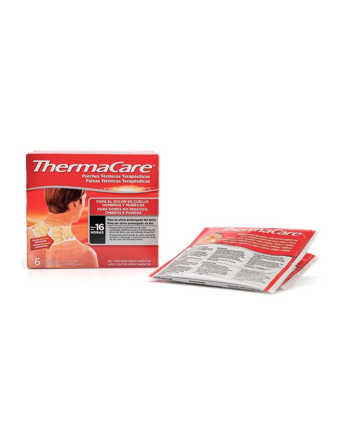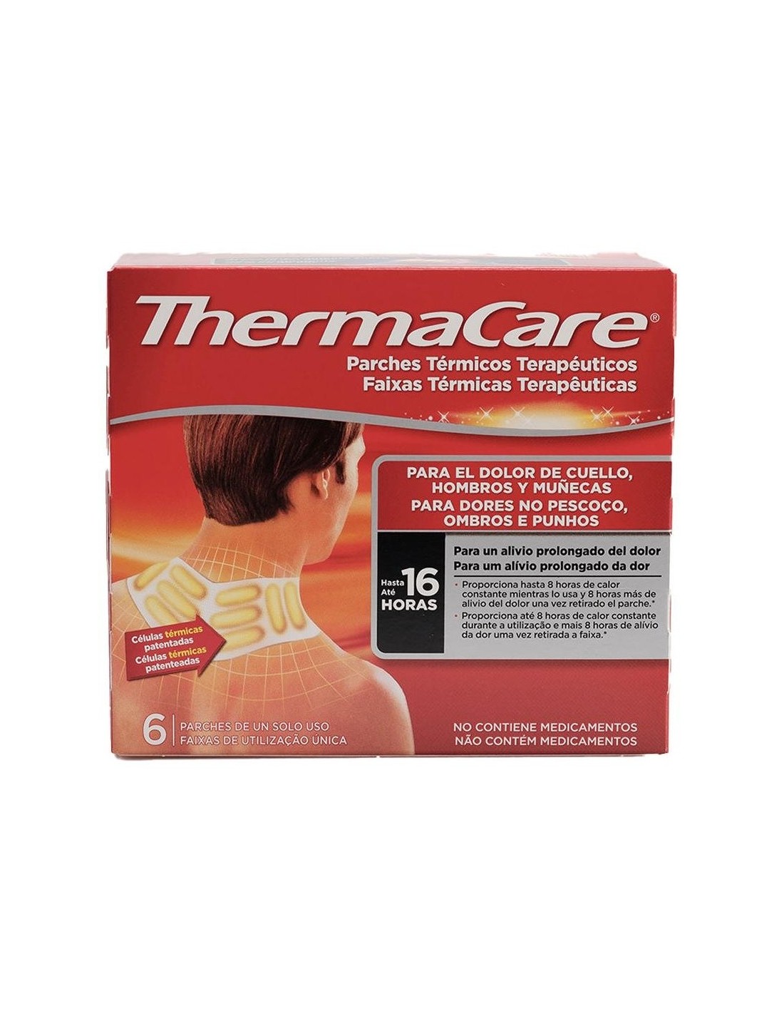 THERMACAREThermaCare® cuello, hombros y muñecas está indicado para tratar el dolor muscular y articular inespecífico en las zonas del cuello, los hombros y las muñecas. Los parches están constituidos por 10 células de calor patentadas y tienen una forma ergonómica para adherirse perfectamente a la piel a través de dos zonas adhesivas. Proporciona alivio prolongaodo durante 16 horas. Esto es, 8 horas mientras se lleva puesto y 8 horas adicionales después de quitárselo.