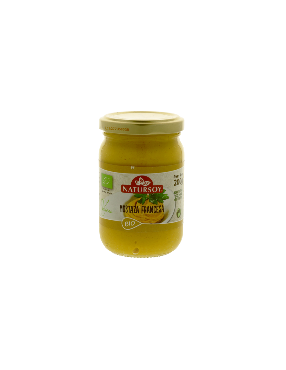 Mostarda francesa Natursoy de agricultura biológica. Adequado para veganos. Ideal para temperar sanduíches, legumes e pratos favoritos. Indicação Natursoy oferece produtos de origem vegetal e agricultura orgânica. Saudável, biológico e de qualidade. NL01 Ingredientes por 100 g: Água, Ácido Láctico, Cúrcuma, Sal Marinho, Xarope de Agave, Funcho, Sementes de Coentro, Vinagre, Sementes de Mostarda Amarela.