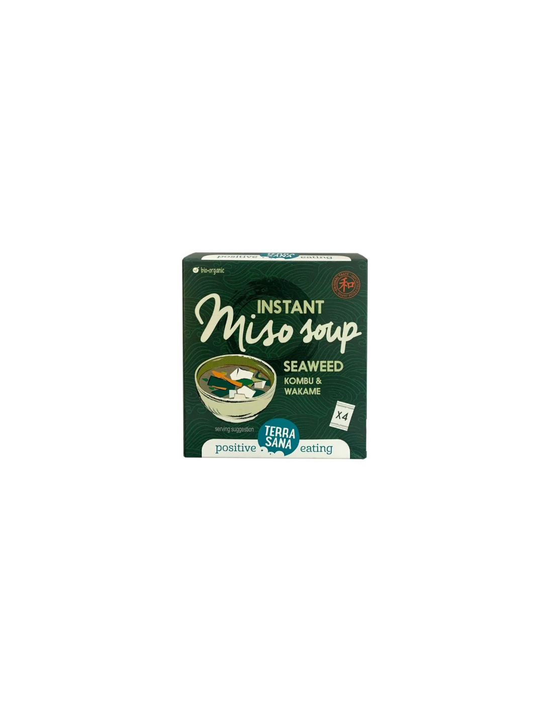 SOPA DE MISO INSTANTÂNEA mistura pura de pó de missô e sopa de algas marinhas - 4 porções - 40 g Está com fome? Você se sente fraco? Com um sachê deste saboroso caldo de missô, você ficará bom em 2 minutos. Não se preocupe com intensificadores de sabor ou ingredientes que não pertencem a você. Esta mistura é mais pura do que pura. Feito com missô e algas marinhas. 4 saquinhos para servir Mugi miso em pó* (soja*, cevada*, sal) (Japão), genmai miso em pó* (soja*, arroz integral*, sal) (Japão), wakame (China), kombu (Japão) * = de agricultura biológica