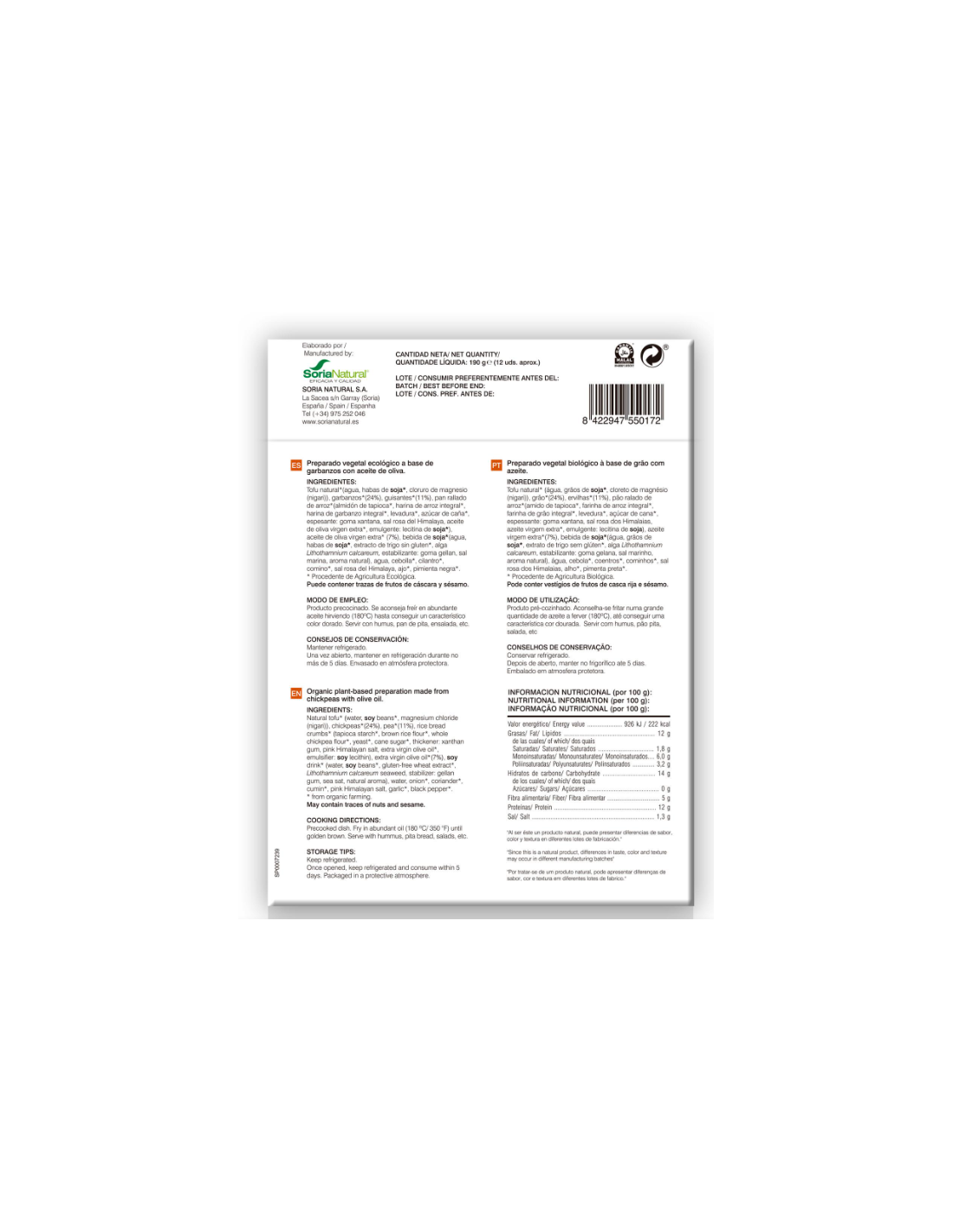 De sabor requintado, o Falafel Bio é um preparado vegetal biológico à base de grão-de-bico com azeite extra-virgem. Ideal para servir com homus, pão pita, salada, etc. Adequado para vegetarianos, veganos, com intolerância a ovos, lactose e/ou glúten. Fonte de fibra. Alto teor de proteína. Alto teor de gorduras insaturadas. Sem açúcares.