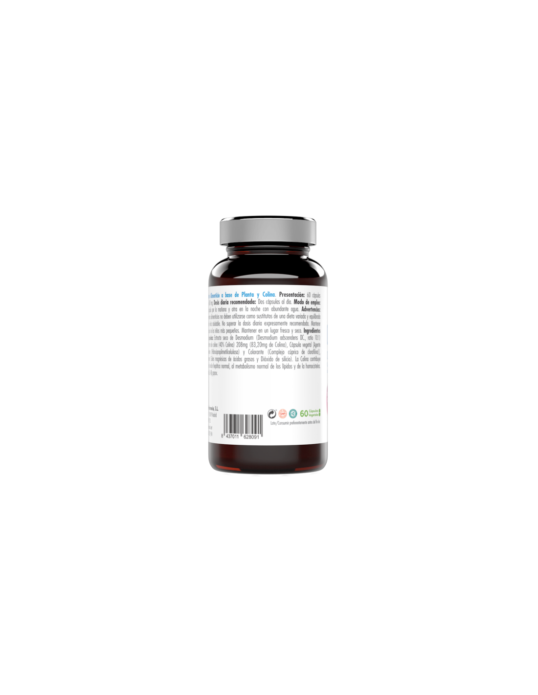 Suplemento alimentar à base de Desmódio e Extrato de Colina. A colina contribui para manter a função hepática normal, o metabolismo normal dos lípidos e da homocisteína Ingredientes por duas cápsulas: Extrato seco de Desmodium (Desmodium adscendens DC., proporção 10:1) 800 mg, bitartarato de colina (40% colina) 208 mg (83,20 mg colina ), Cápsula Vegetal [Agente de Revestimento (Hidroxipropilmetilcelulose) e Corante (Complexo Cúprico de Clorofilina)], Antiaglomerantes (Sais de Magnésio de Ácidos Graxos e Dióxido de Silício). Modo de usar: Tomar uma cápsula pela manhã e outra à noite com bastante água. Dose diária recomendada: 2 cápsulas ao dia. Advertências e Precauções: Os suplementos alimentares não devem ser utilizados como substitutos de uma alimentação variada e equilibrada e de um estilo de vida saudável. Não exceda a quantidade diária expressamente recomendada. Mantenha fora do alcance de crianças. Não use em grávidas ou lactantes. Conservar em local seco e fresco. Apresentação: 60 cápsulas de 608 mg.