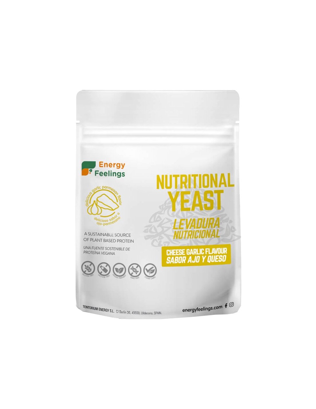 ENERGY FEELINGSLa Levadura Nutricional Ajo Parmesano de Energy Feelings es un grandioso súper alimento para enriquecer el valor nutritivo de cualquier preparación. Es inactiva y no provoca el desarrollo de levaduras en el tracto intestinal. Con 43% de proteínas biodisponibles es extraordinariamente rica en todas las vitaminas del grupo B: B1, B2, B3, B5, B6, B9. Especialmente pensado para las personas veganas y flexi veganas. A diferencia de la más comúnmente comercializada levadura de cerveza, La Levadura Nutricional Ajo Parmesano de Energy Feelings es un producto concebido para la alimentación humana, puro y limpio, libre de los residuos potencialmente tóxicos de la industria cervecera y con un delicioso sabor a ajo parmesano. Sin gluten ni lactosa. Producto vegano.-