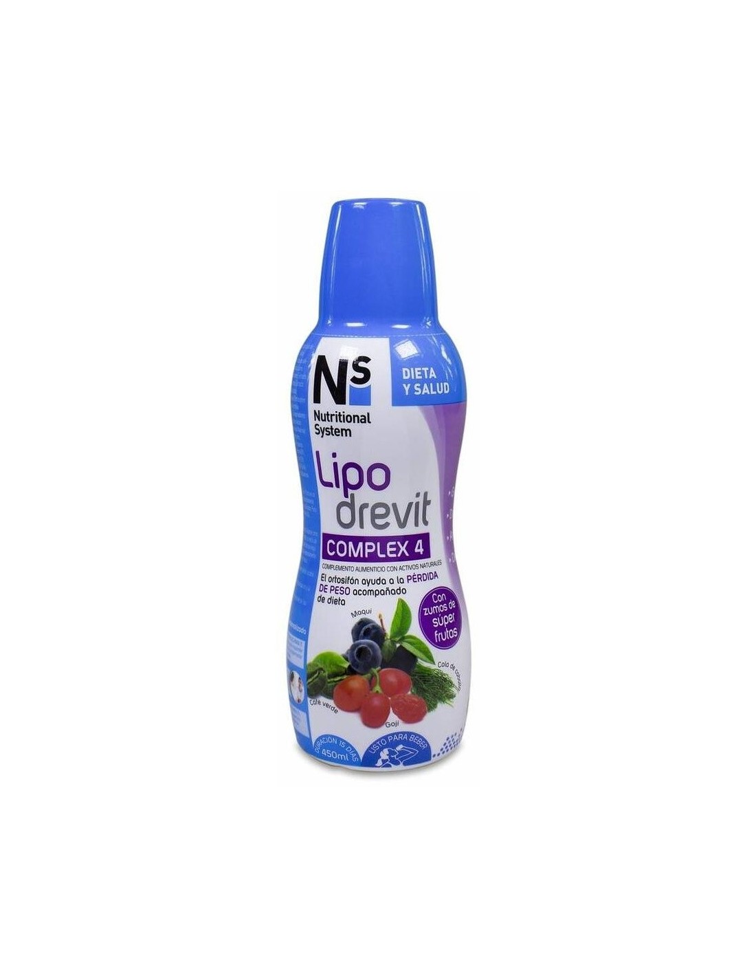 Agua; Fructosa líquida; Extracto fluido de parte aérea de cola de caballo (0.19% ác. Gálico) (Equisetum arvense); Extracto seco de semillas de café verde (45% ácido clorogénico) Coffea arabica); Zumo concentrado de bayas de Goji (Lycium barbarum); Extracto seco de hojas de té matcha (Camellia sinensis); Extracto seco de hojas de abedul (2% rutina) (Betula alba); Extracto seco de ortosifón (0.1% sinensetina) (Orthosiphon stamineus); Zumo concentrado de Maqui (Aristotelia chilensis); Ácido L-ascórbico (Vitamina C); Conservadores: Benzoato sódico, Sorbato potásico; Acidulante: Ácido cítrico; Aroma frutas del bosque; Nicotinamida (Niacina); D-alfa-tocoferol (50% Vitamina E); Citrato de zinc; Riboflavina (Vitamina B2); Clorhidrato de Piridoxina (Vitamina B6); Clorhidrato de Tiamina (Vitamina 61); Retinol (6% Vitamina A); Picolinato de cromo (12% cromo); Ácido pteroilmonoglutámico (Ácido Fólico); Colecalciferol (0.25% Vitamina D3); Cianocobalamina. \ \ Por 100 ml: \ Extracto fluido de cola de caballo: 1666,67 mg Café verde E.S. (45% clorogénico): 1500 mg Zumo de bayas de Goji: 623,33 mg Hoja de Té marcha E.S.: 333,33 mg Hoja de abedul E.S. (2% inulina): 333,33 mg Hoja de ortosifón E.S. (0,1% sinensetina): 333,33 mg Zumo de Maqui: 266,67 mg Vitamina C: 266,67 mg Vitamina B3 (niacina).: 53,33 mg Vitamina E: 40 mg Zinc: 5 mg Vitamina B2: 4,67 mg Vitamina B6: 4,67 mg Vitamina B1: 3,67 mg Vitamina A: 2666,67 mcg Vitamina B9 (ácido fólico): 666,67 mcg Cromo: 133,33 mcg Vitamina D: 16,67 mcg Vitamina B12: 8,33 mcg