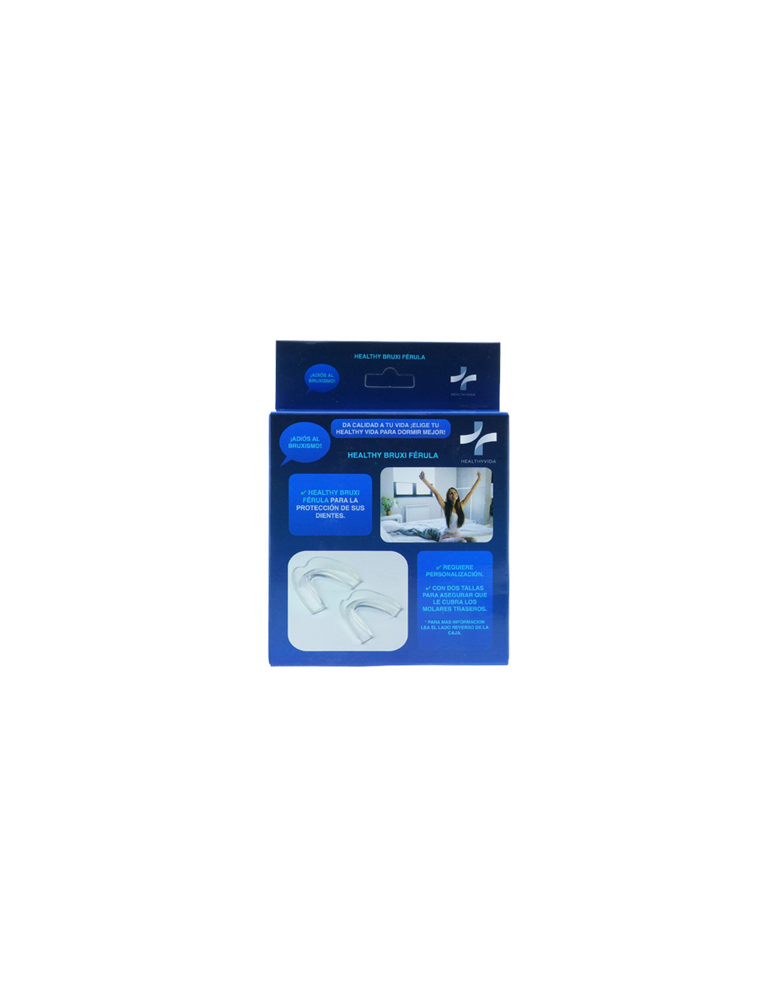 HEALTHY BRUXI Férula está indicada para aquellas personas que produzcan roce y rechinamiento no funcional de los dientes. Requiere personalización para su fácil adaptación en la boca. Fabricado con material totalmente hipoalergénico. Se presentan las férulas en un embolsado estéril, dentro de una caja protectora que también se podrá utilizar para guardarla después de su uso y en el interior contiene el folleto de instrucciones.\ Esta férula ayuda a disminuir los síntomas del bruxismo:\ Protegerá y disminuirá la presión de los dientes.\ Relajará la mandíbula.\ Aliviará el dolor de cabeza y las tensiones relacionada con el rechinamiento y el desgaste dentales.