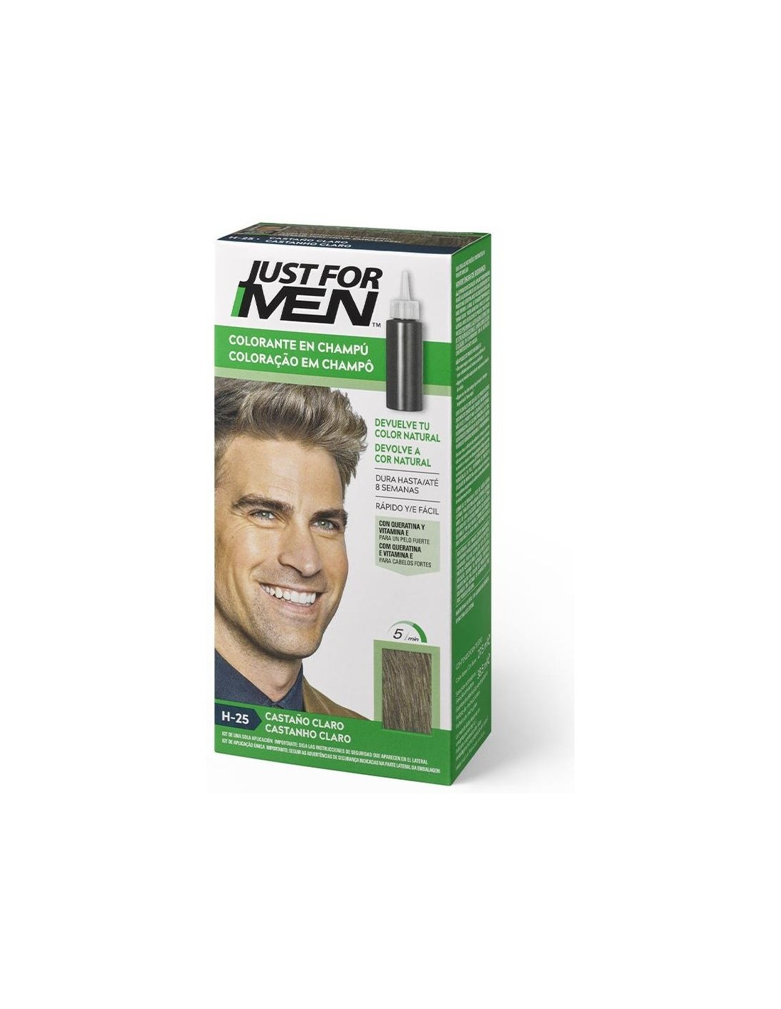JUST FOR MENColorante en champú. Restaura el color original. Aspecto 100% natural. Con queratina y vitamina E para un cabello fuerte. Resultados en 5 minutos. No se decolora al lavarlo, dura hasta 8 semanas o cuando las canas vuelvan a crecer.