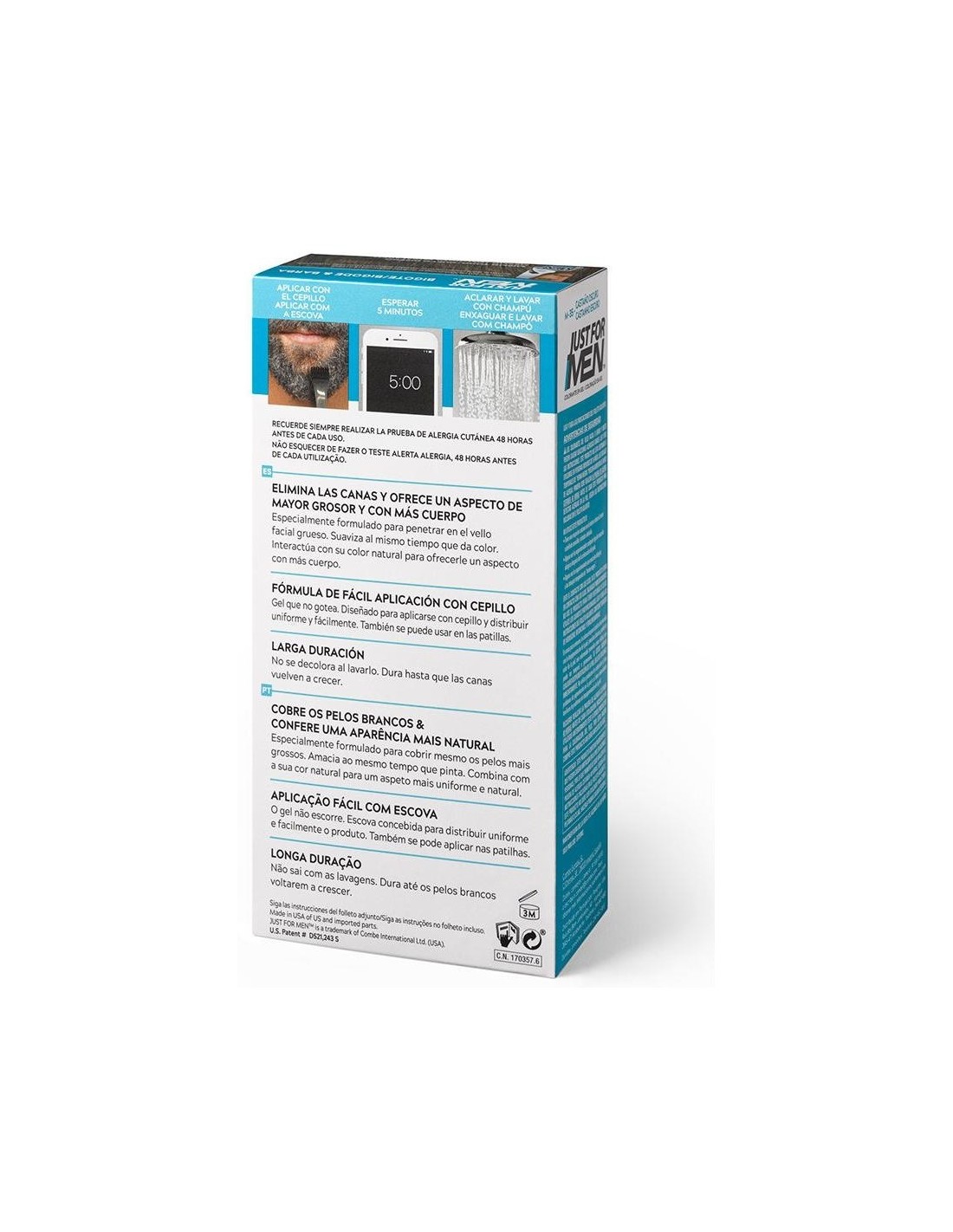 JUST FOR MENElimina las canas para lograr un aspecto de mayor grosor y con más cuerpo. Suaviza al mismo tiempo que da color. Coloración con cepillo de fácil aplicación. Fórmula más cremosa. Aplicación más fácil. Con biotina, aloe y aceite de coco. Resultados en 5 minutos. Dura hasta que las canas vuelven a crecer.