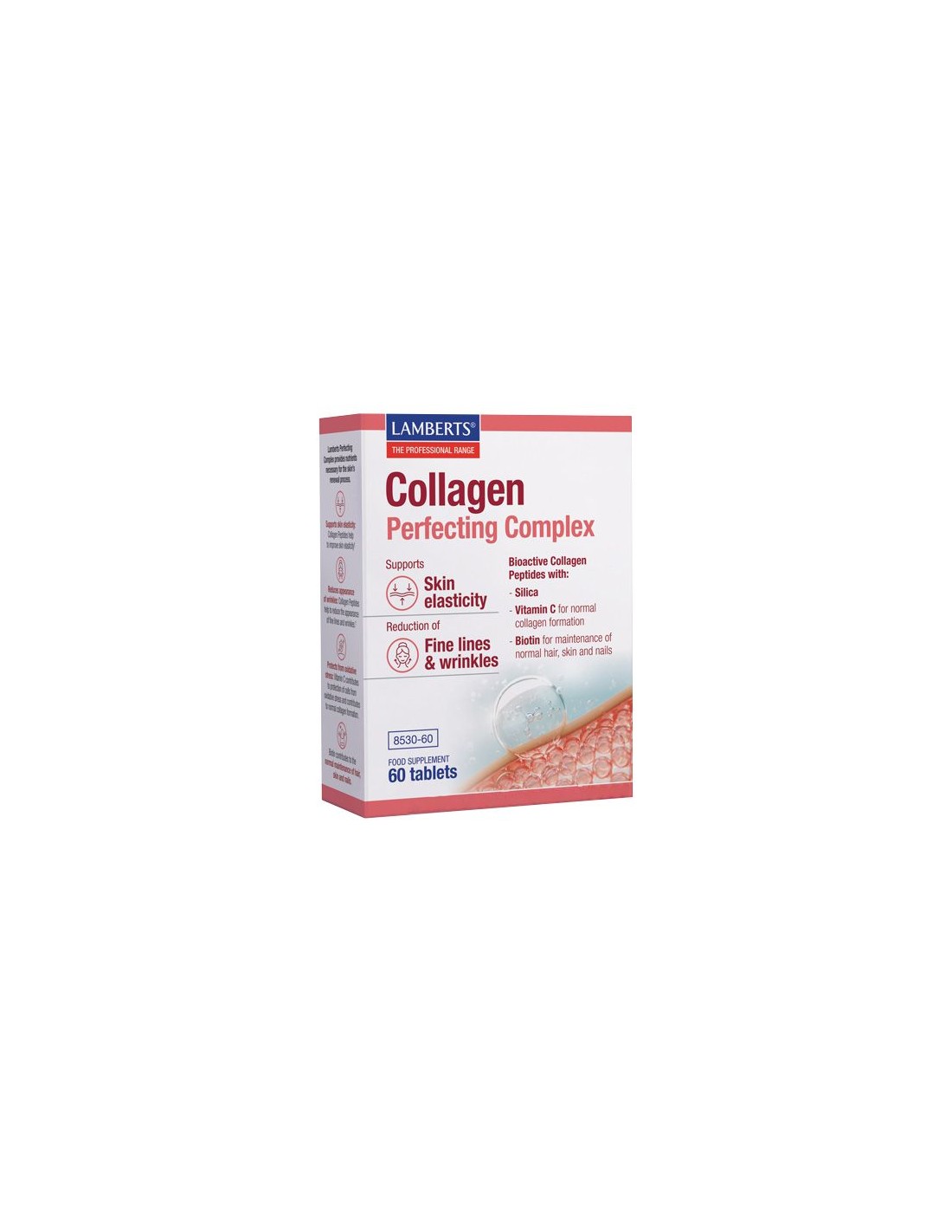 LAMBERTSCollagen Perfecting Complex, ha sido formulado con péptidos bioactivos de colágeno Verisol P®. Los péptidos bioactivos de colágeno ayudan a incrementar la producción de colágeno en piel, pelo y uñas. El colágeno tipo I y III son los principales tipos de colágeno que se encuentran en la piel. La Vitamina C, desempeña un papel en la formación normal de colágeno, el cual contribuye a mantener la piel en condiciones normales. La biotina también ayuda a mantener la piel en condiciones normales. Además, aporta silicio procedente del bambú (Bambusa arundinacea), en una concentración de 20 mg por tableta, ya que es un nutriente importante para la formación y firmeza de los tejidos estructurales.