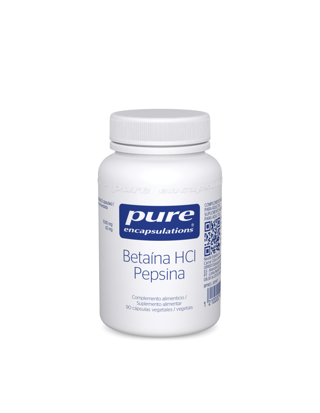PURE ENCAPSULATIONSBetaína HCl (molécula constituida por betaína y ácido clorhídrico) junto con pepsina, enzima que descompone las proteínas en péptidos más simples. Producto indicado para personas con baja producción de ácido clorhídrico.