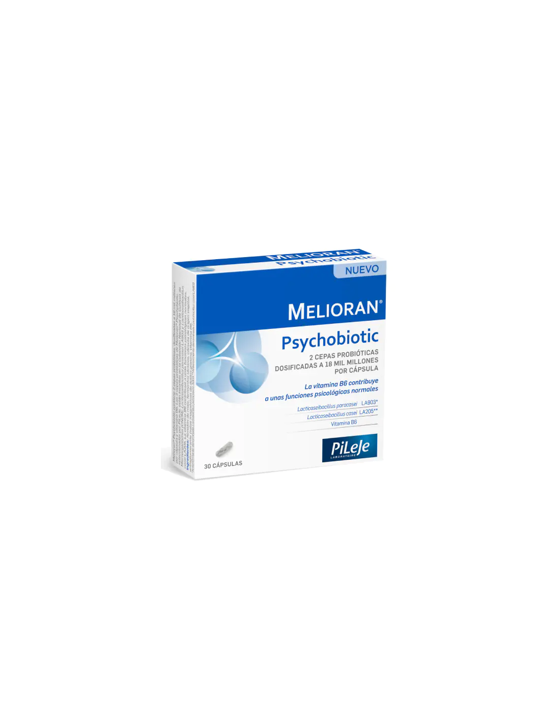Melioran® Psychobiotic está diseñado para personas en situaciones de estrés y ansiedad habituales, gracias a su composición a base de vitamina B6. La vitamina B6 contribuye a unas funciones psicológicas normales. Las cepas Lacticaseibacillus paracasei LA903, antes denominada Lactobacillus paracasei LA903, y Lacticaseibacillus casei LA205, antes denominada Lactobacillus casei LA205, han sido seleccionadas mediante un proceso específico de investigación y fabricación exclusivo del laboratorio PiLeJe.